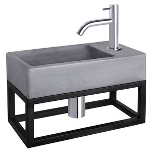 Deze combinatie bestaat uit het stijlvolle donker betonnen fontein Force met chromen gebogen koudwaterkraan, afvoerplug en sifon. Het handige bijpassende mat zwarte handdoekrek, waar u bijvoorbeeld uw handdoeken of andere toiletbenodigdheden kunt plaatsen of hangen, maakt de set helemaal af. Het kraangat zit aan de rechterkant van dit stijlvolle fontein. Het betonnen materiaal is zeer stevig en heeft een waterdichte coating. Beton zorgt voor een industriële uitstraling .
