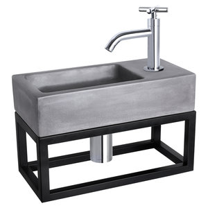 Deze combinatie bestaat uit het stijlvolle donker betonnen fontein Ravo met chromen gebogen kruis koudwaterkraan, afvoerplug en sifon. Het handige bijpassende mat zwarte handdoekrek, waar u bijvoorbeeld uw handdoeken of andere toiletbenodigheden kunt plaatsen of hangen, maakt de set helemaal af. Het kraangat zit aan de rechterkant van dit stijlvolle wasbakje. Het betonnen materiaal is zeer stevig en heeft een waterdichte coating. Beton zorgt voor een industriële uitstraling en is goed te combineren.