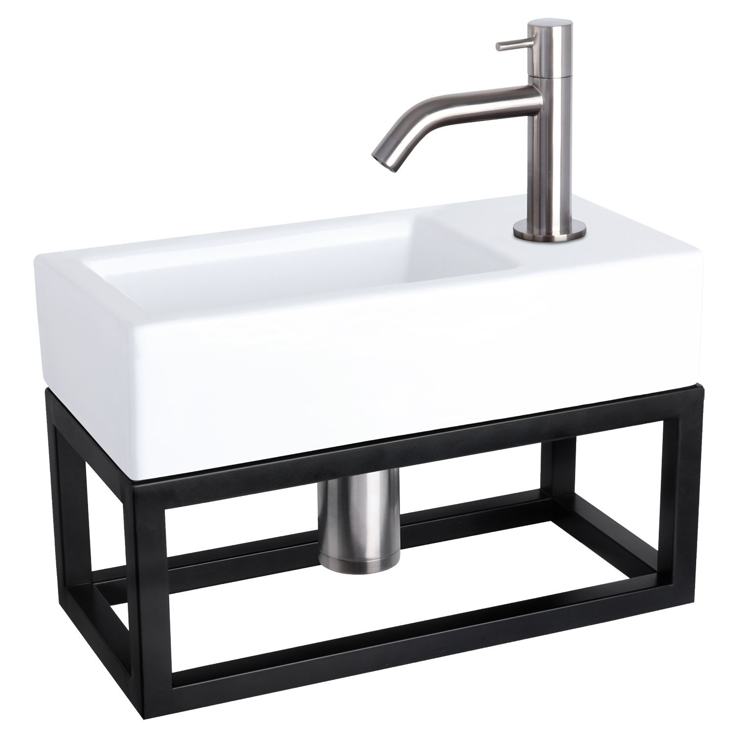 Deze combinatie bestaat uit het stijlvolle keramische fontein Ravo met mat chromen gebogen koudwaterkraan, afvoerplug en sifon. Het handige bijpassende mat zwarte handdoekrek, waar u bijvoorbeeld uw handdoeken of andere toiletbenodigheden kunt plaatsen of hangen, maakt de set helemaal af. Het kraangat zit aan de rechter kant van dit subtiele wasbakje. Keramiek is een duurzaam materiaal, eenvoudig schoon te houden en gaat jaren mee.