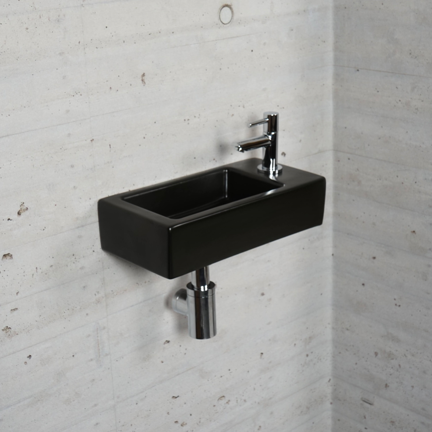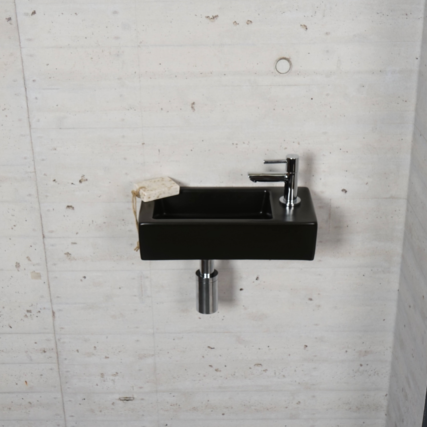 De fontein kent verder een mat zwarte kleur en heeft een rechthoekige vorm. Aan de rechterkant van het fonteintje bevindt zich het kraangat.