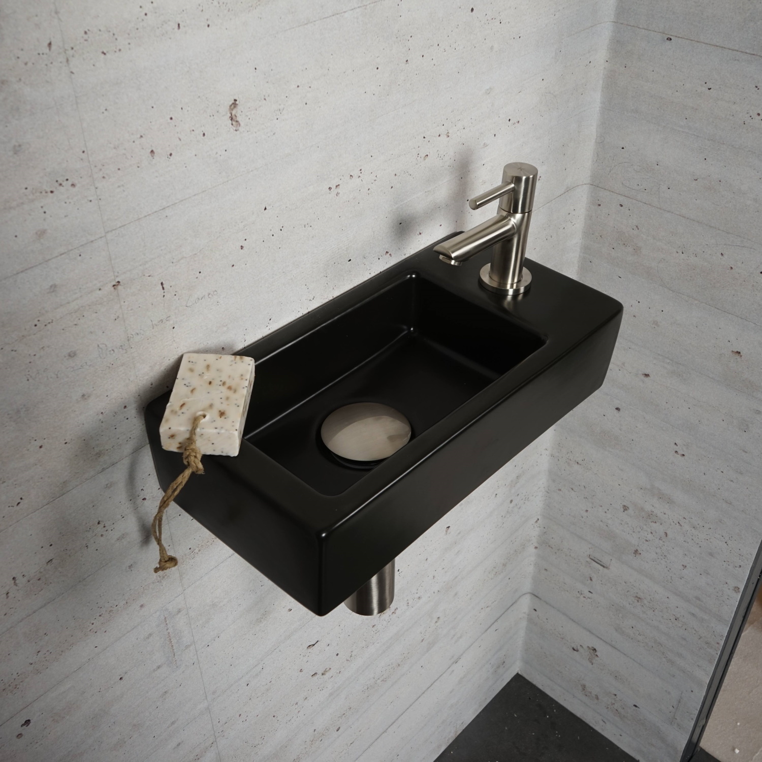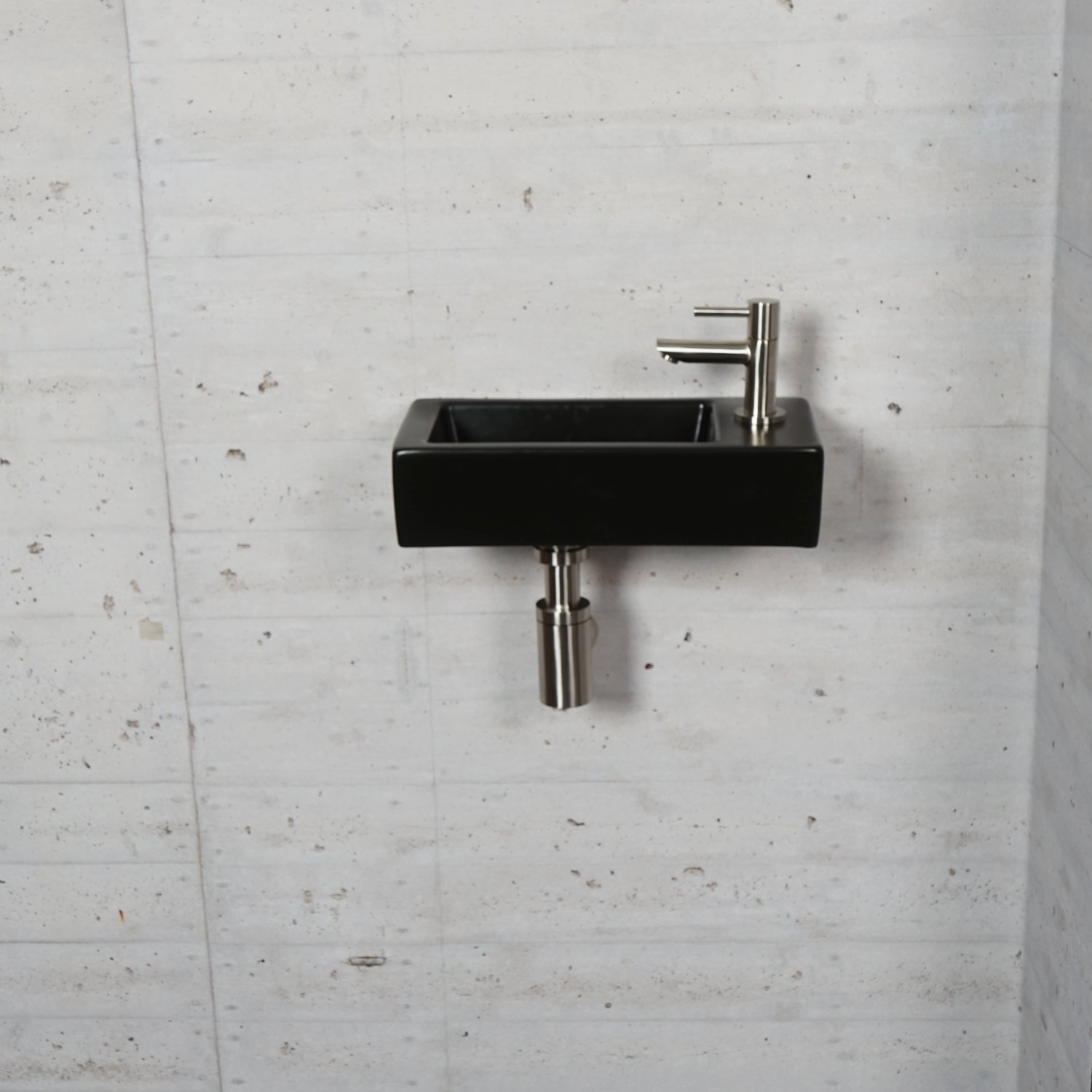 De fontein kent verder een mat zwarte kleur en heeft een rechthoekige vorm. Aan de rechterkant van het fonteintje bevindt zich het kraangat.