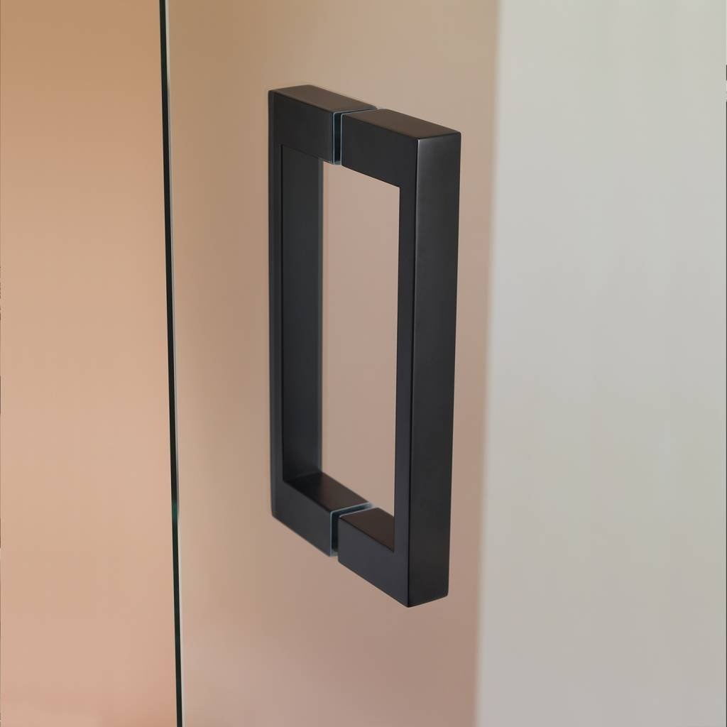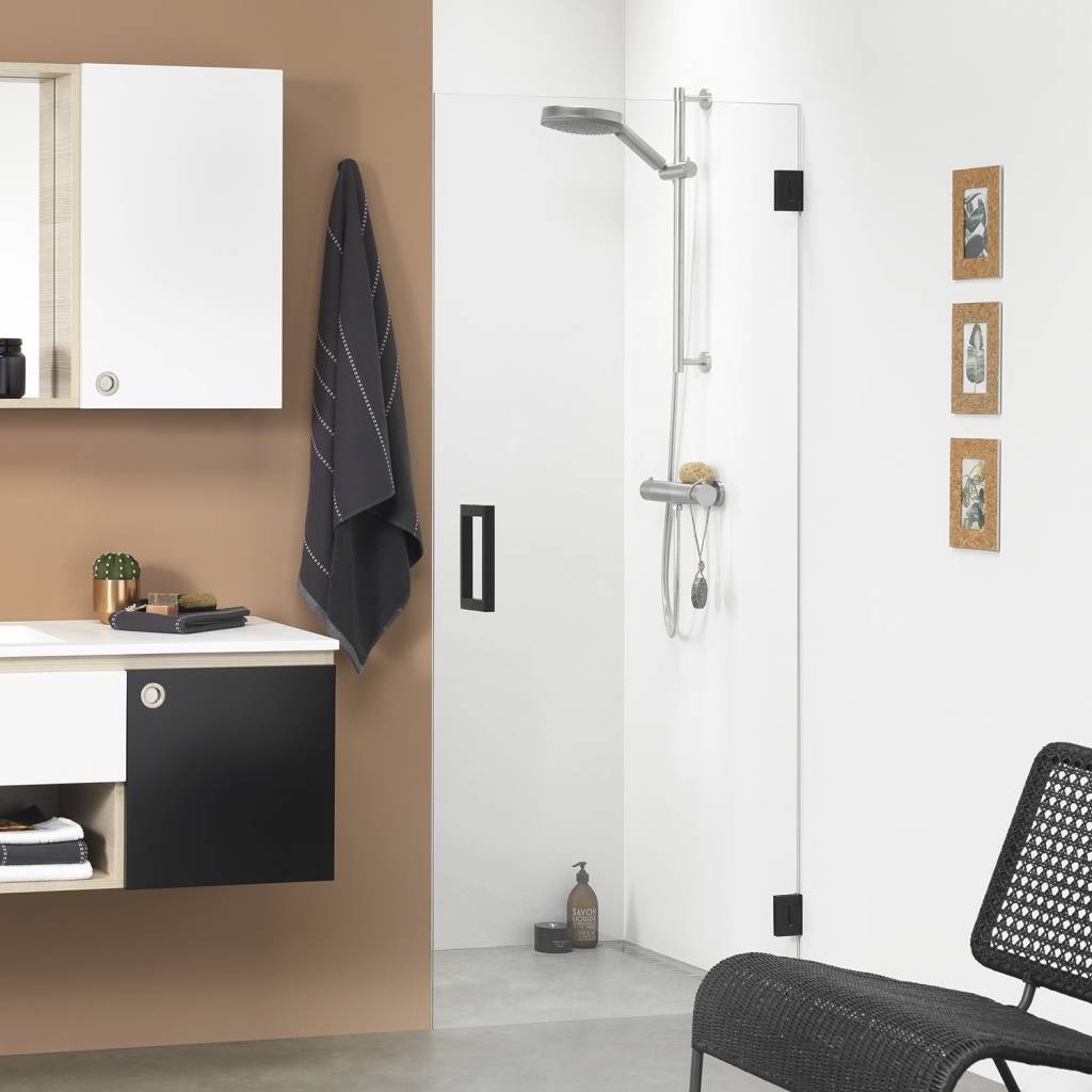 Deze draaideur, voor plaatsing in een nis van 70 cm breed, wordt geleverd inclusief scharnieren en deurgreep. Wat deze deur écht bijzonder maakt, is de matzwarte afwerking. Zo breng je een unieke sfeer in je badkamer.