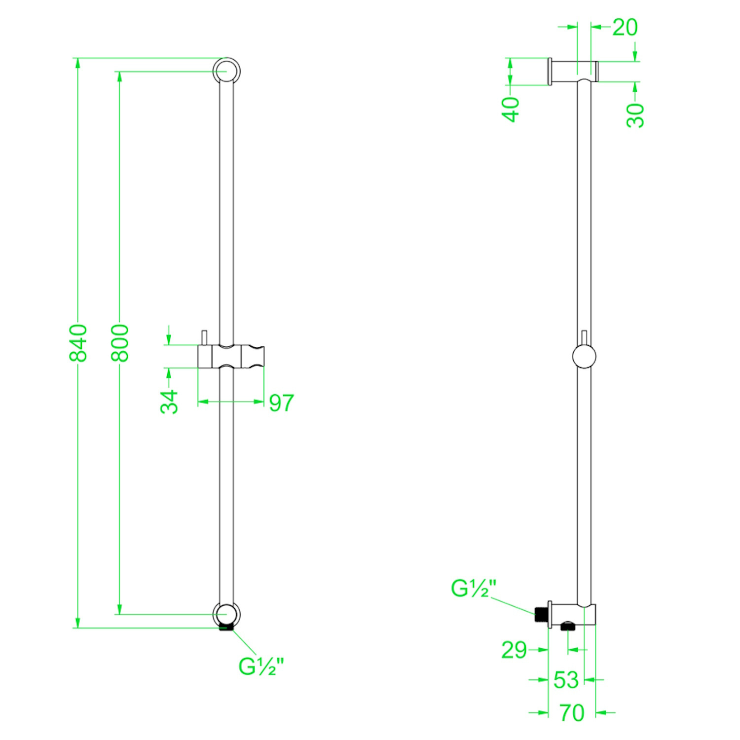 De glijstang heeft een lengte van 80 cm en een breedte van 2 cm. De breedte van het glijstuk is 9,7 cm.