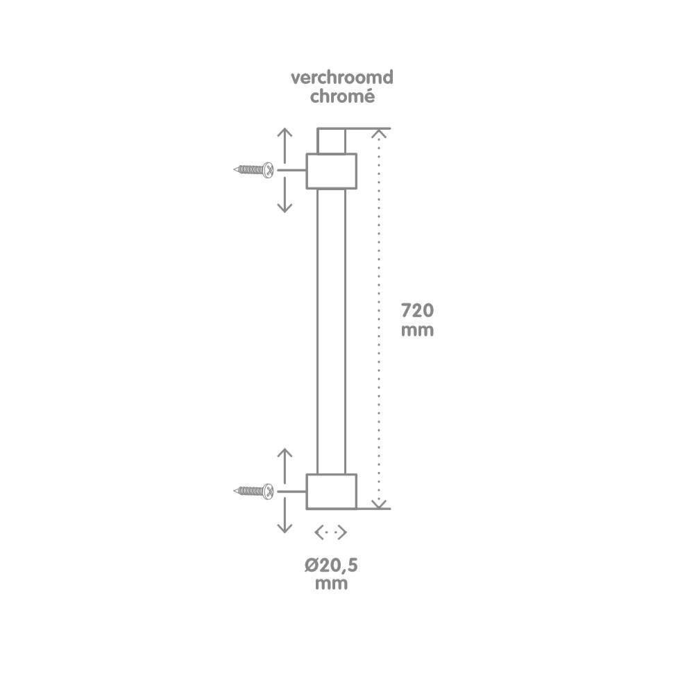 De chromen glijstang is 72cm hoog en voorzien van een verstelbare handdouchehouder. Er wordt bevestigingsmateriaal meegeleverd om de glijstang te bevestigen aan de muur. De diameter van de stang is 2 cm en wordt exclusief garnituur geleverd.