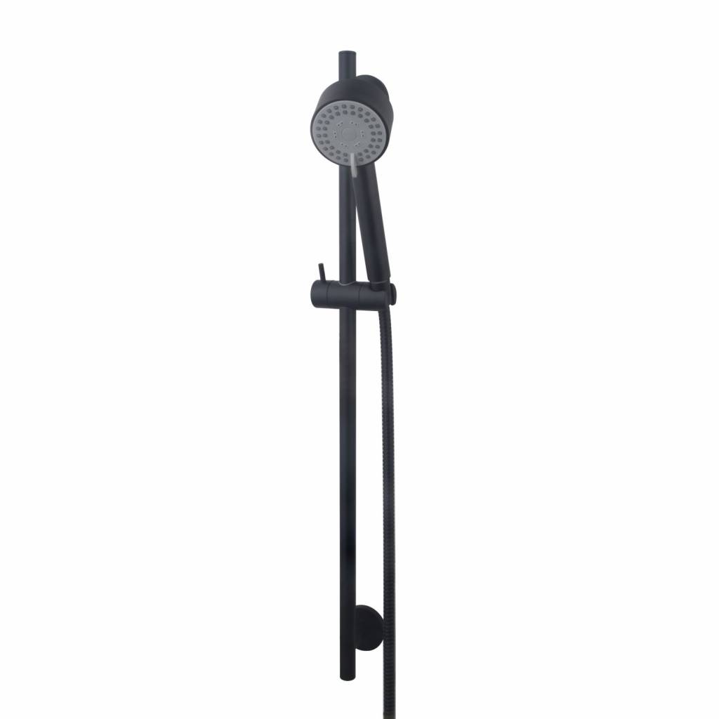 De zwarte glijstangset is compleet met handdouche met verschillende standen en doucheslang is 150cm. De handdouchehouder is verstelbaar om de handdouche op de juiste hoogte te kunnen instellen.