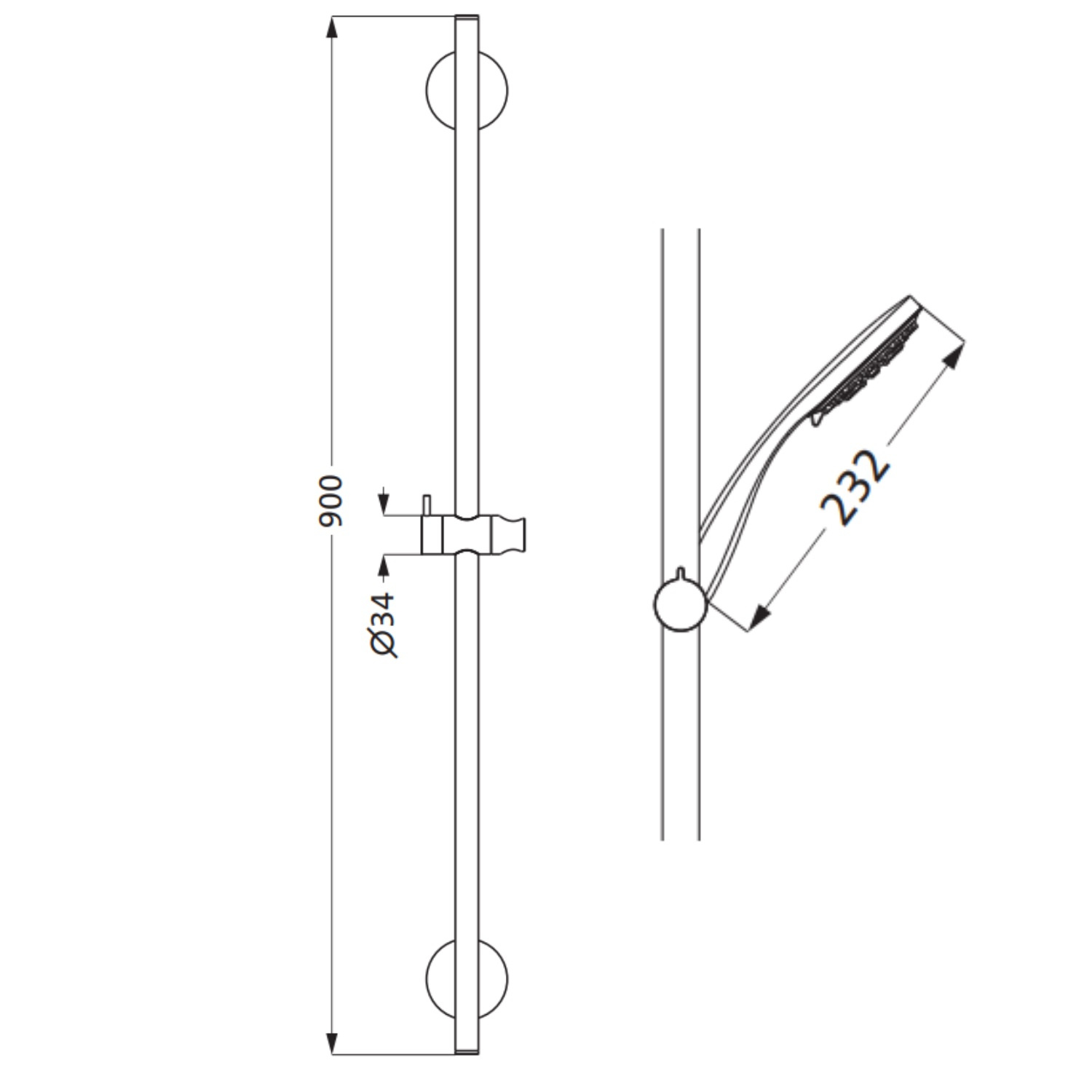 De lengte van de glijstang is 90 cm met een diameter van 2,4 cm. Op deze glijstang zit een conische houder waar u de handdouche in kunt plaatsen zodat u hem ook als douchekop kunt gebruiken. De conische houder is namelijk ook nog traploos in hoogte verstelbaar en kantelbaar waardoor deze alle kanten op kan draaien.