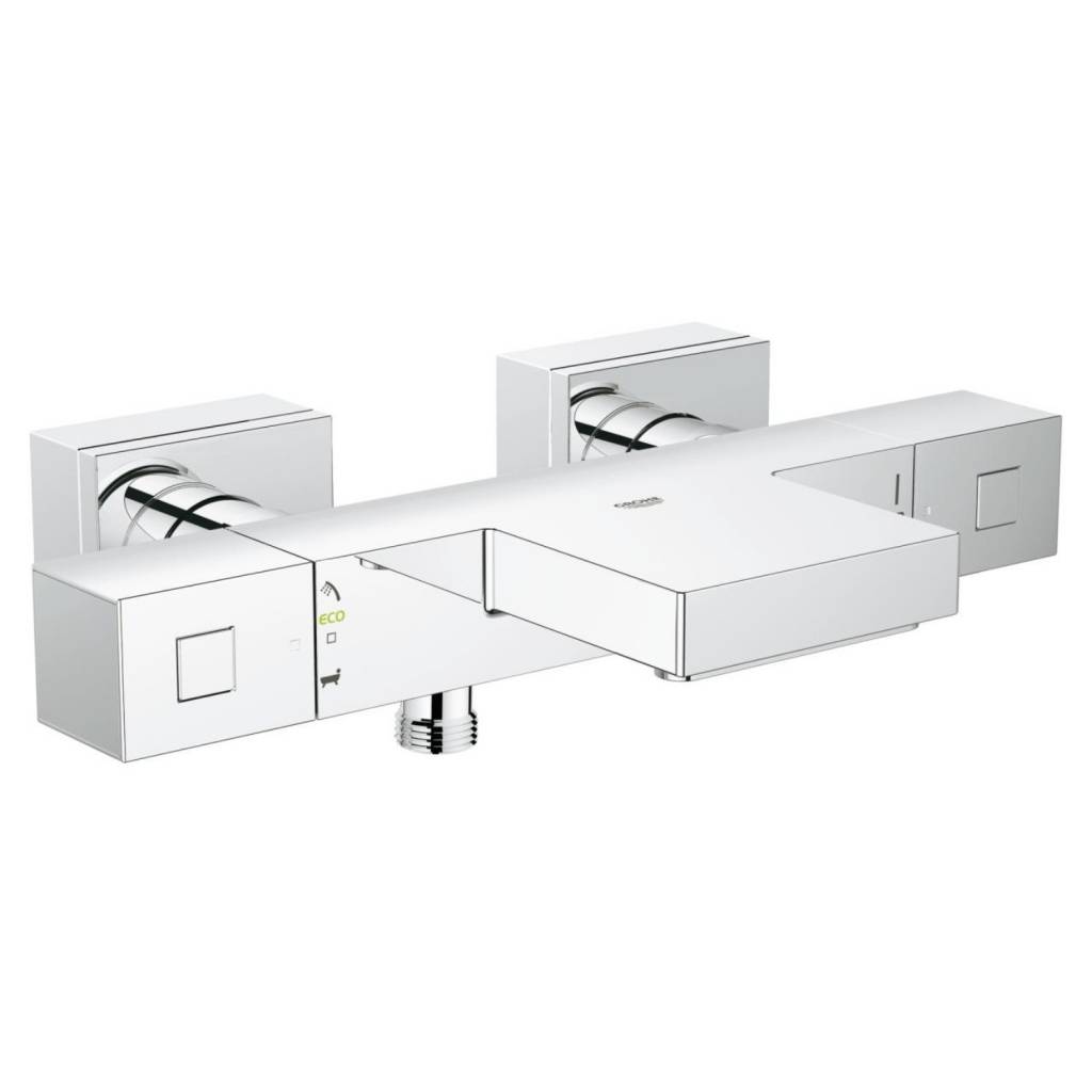 Deze innovatieve precisie thermostatische badkraan voor het bad zal je verrassen. De extra brede uitloop geeft je het gevoel van een kleine waterval in je eigen badkamer. En of je nu het bad wilt vullen of wilt douchen, GROHE Turbo Stat zorgt vrijwel direct voor een constante gewenste temperatuur. En door de GROHE Safe Stop techniek wordt het water nooit heter dan de ingestelde temperatuur. Wel zo veilig als er kinderen in het spel zijn. De Aqua Dimmer Eco, de knop waarmee je wisselt tussen de douche- en badstand, heeft een ingebouwde water besparingsfunctie. Met GROHE Easy Logic gaat het bedienen van de kraan intuïtief. En al die praktische techniek is verpakt in de prachtige chromen GROHE Star Light beschermlaag die minimaal onderhoud vraagt. Afnemen met een zachte doek is voldoende voor een jarenlange glans.