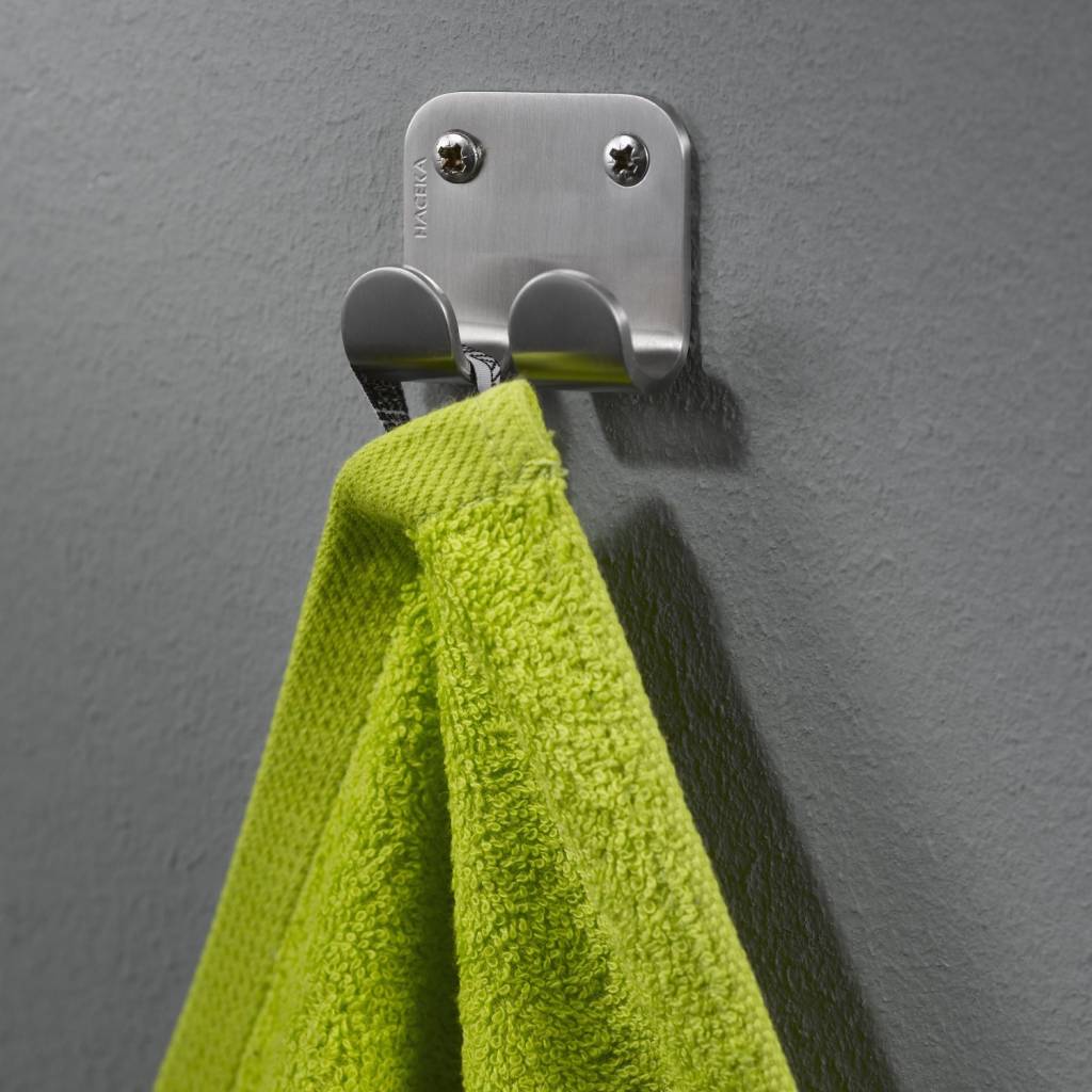 Deze stoere, dubbele haak oogt compact. Toch kunt u er twee handdoeken moeiteloos op kwijt. Montage De schroeven en pluggen voor bevestiging zitten in de verpakking. Wij adviseren niet in de voeg van de tegel te boren. De accessoire heeft dan niet genoeg houvast om recht te blijven hangen. Voor een stevige montage is het dus beter om in de tegel te boren. Om te voorkomen dat de boor uitschiet, kunt u eerst wat tape op de tegel plakken.