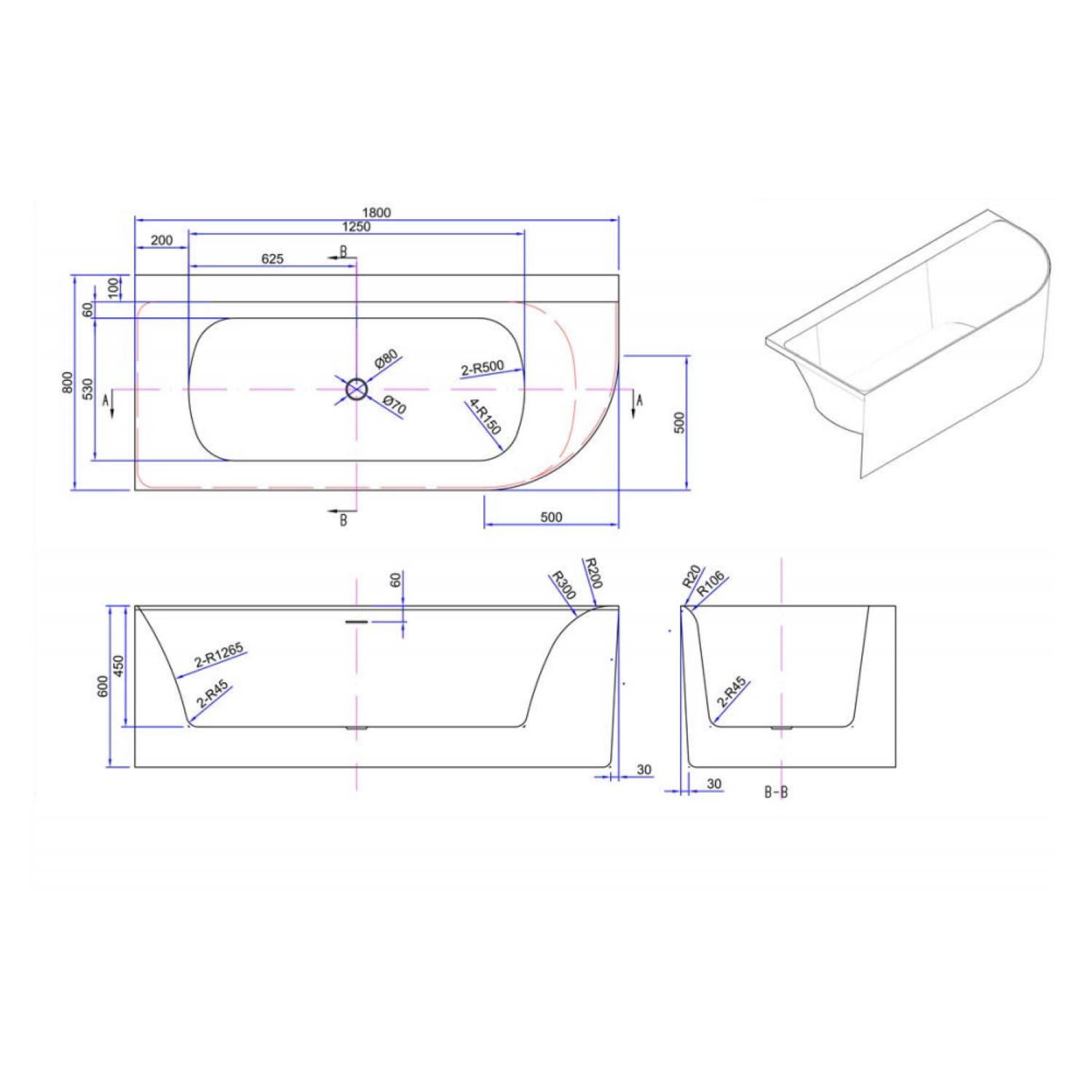 Het half vrijstaande hoekbad is aan de linkerkant recht afgewerkt, terwijl de rechterkant een halfronde vorm heeft. Dit bad is tevens leverbaar in een variant waarbij de rechterkant recht is afgewerkt en de linkerkant rond. Aan de zijkant van het bad bevindt zich een kleine gleuf die dient als overloop. Deze overloop zorgt ervoor dat wanneer het bad te vol begint te lopen het water automatisch via deze gleuf de riolering in loopt. Het bad heeft een lengte van 180 cm, een breedte van 80 cm en een hoogte van 60 cm.