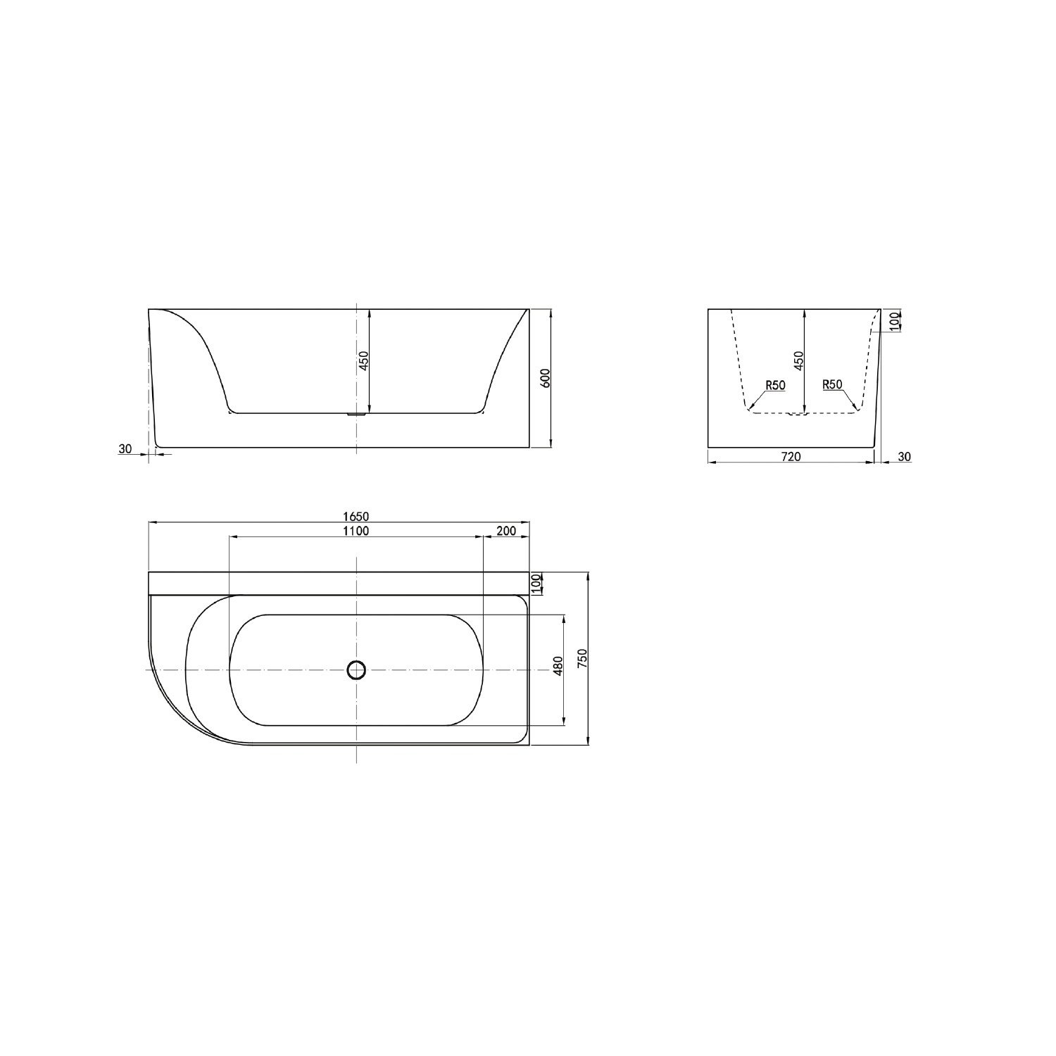 Aan de zijkant van het vrijstaande ligbad bevindt zich een kleine gleuf die dient als overloop. Deze overloop zorgt ervoor dat wanneer het bad te vol begint te lopen het water automatisch via deze gleuf de riolering in loopt. Het bad heeft een lengte van 165 cm, een breedte van 75 cm en een hoogte van 60 cm.