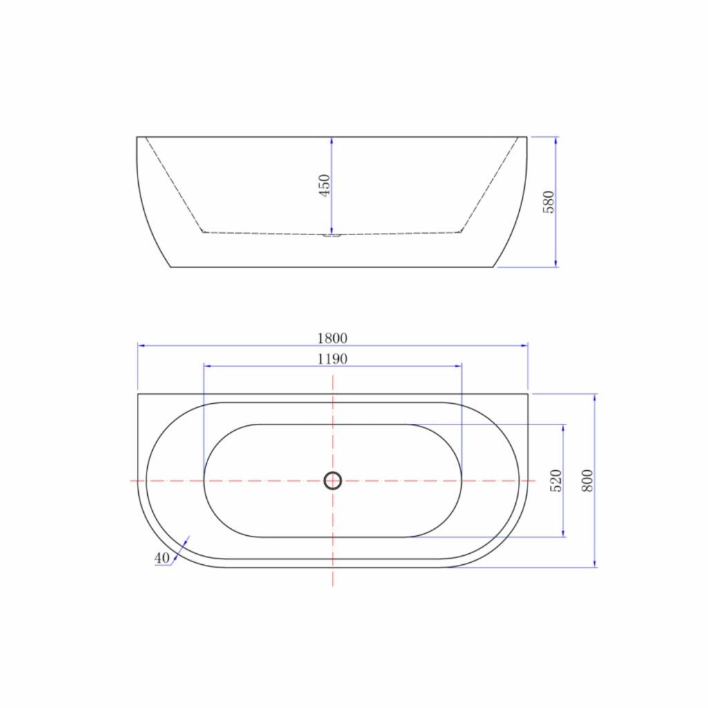 Het bad is 180cm lang en 80cm breed, genoeg om gezellig met zijn tweeën in te zitten. De afvoer zal niet in de weg zitten want die zit netjes in het midden. De rand van het bad is 3.5cm breed. Er zit overigens een bad afvoer bij het bad voorzien van een chromen click waste, sifon met flexibele afvoerpijp van 40mm. (Sifon steekt er niet onderuit.) Is daarnaast voorzien van een overloop.