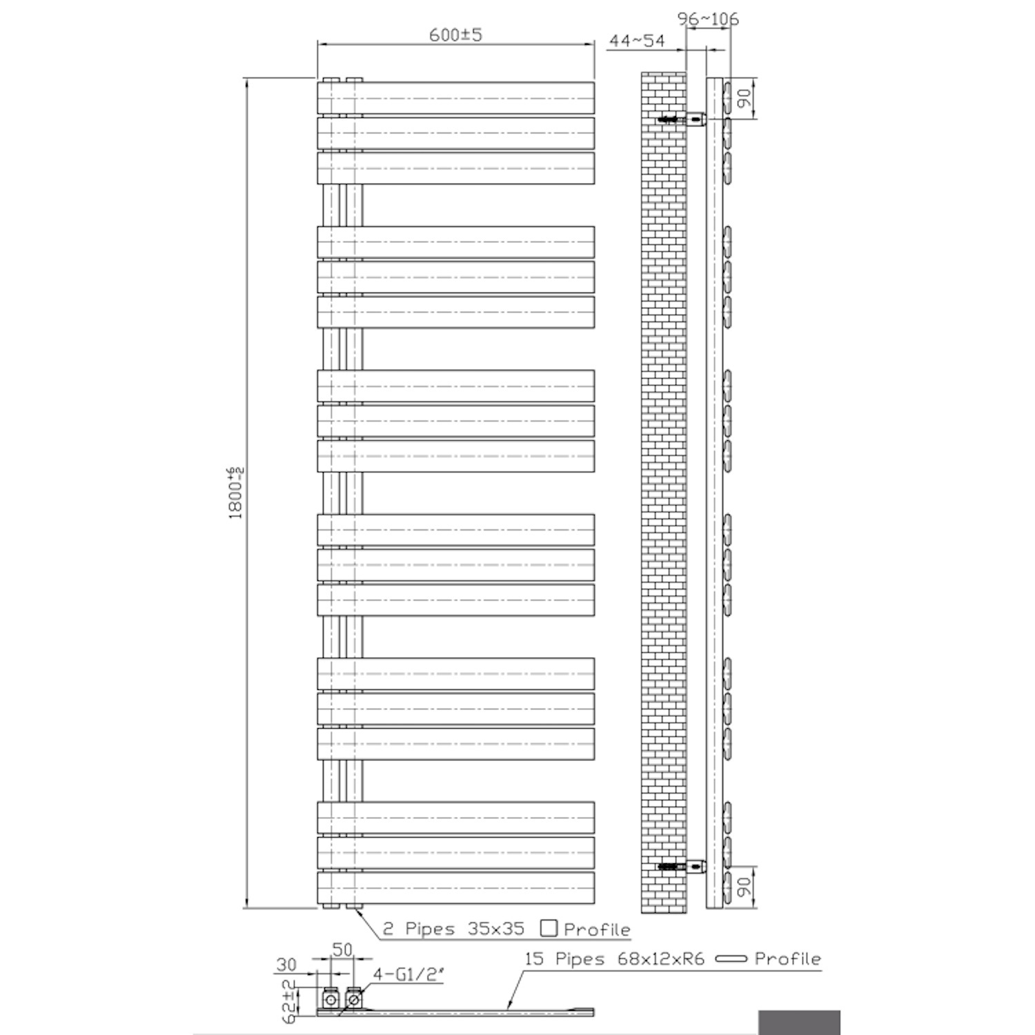 De radiator heeft een hoogte van 180 cm en een breedte van 60 cm. De radiator heeft een wattage van 1021 en is verkrijgbaar het Wit.