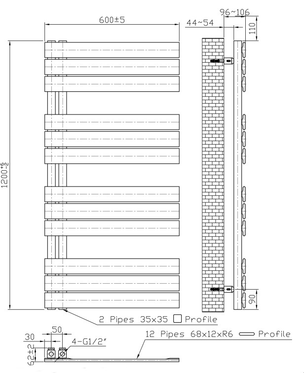 De radiator heeft een hoogte van 120 cm en een breedte van 60 cm.