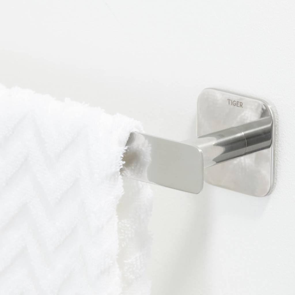 Het badhanddoekrek uit de Colar serie van Tiger is uitgevoerd in gepolijst rvs. De handdoekhouder is voorzien van een krachtige dubbelzijdige tape waardoor montage op iedere gladde, stevige ondergrond zeer eenvoudig is. De Colar serie bevat tevens een groot aantal aanvullende accessoires voor de badkamer en toiletruimte in dezelfde stijl.