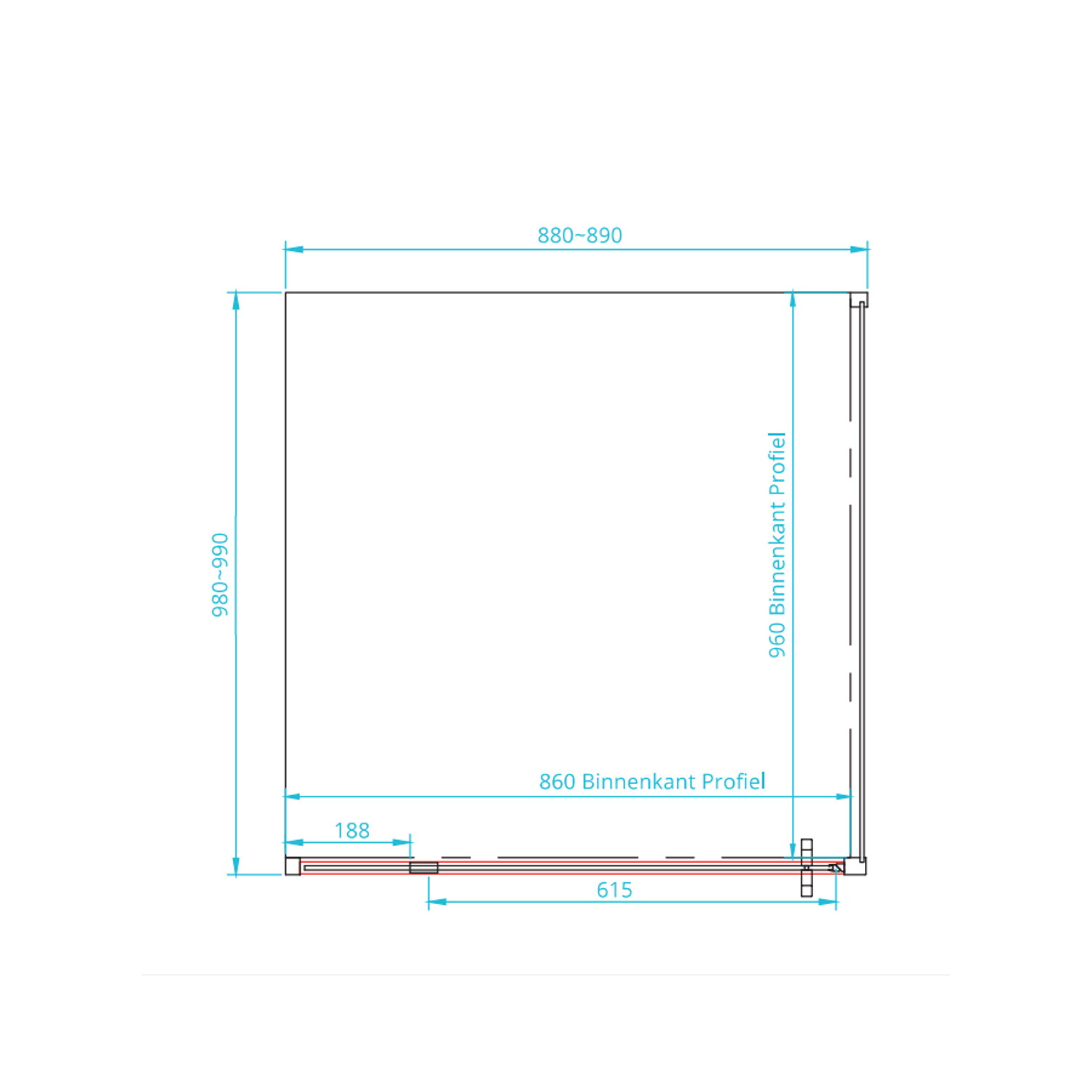 Douchedeur is verstelbaar van 88 cm tot 89 cm en de zijwand is verstelbaar van 98 cm tot 99 cm.