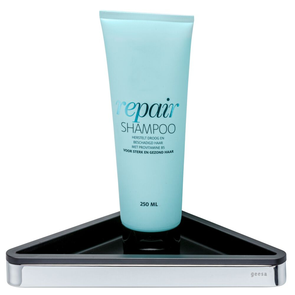Met deze handige hoekplanchet heeft u altijd plek voor uw shampoo, douchegel en bodylotion in uw badkamer. Voorzien van een kunststof uitneembare inzet. De planchet is Zwart met chroom accent. Hij is van kunststof met messing.