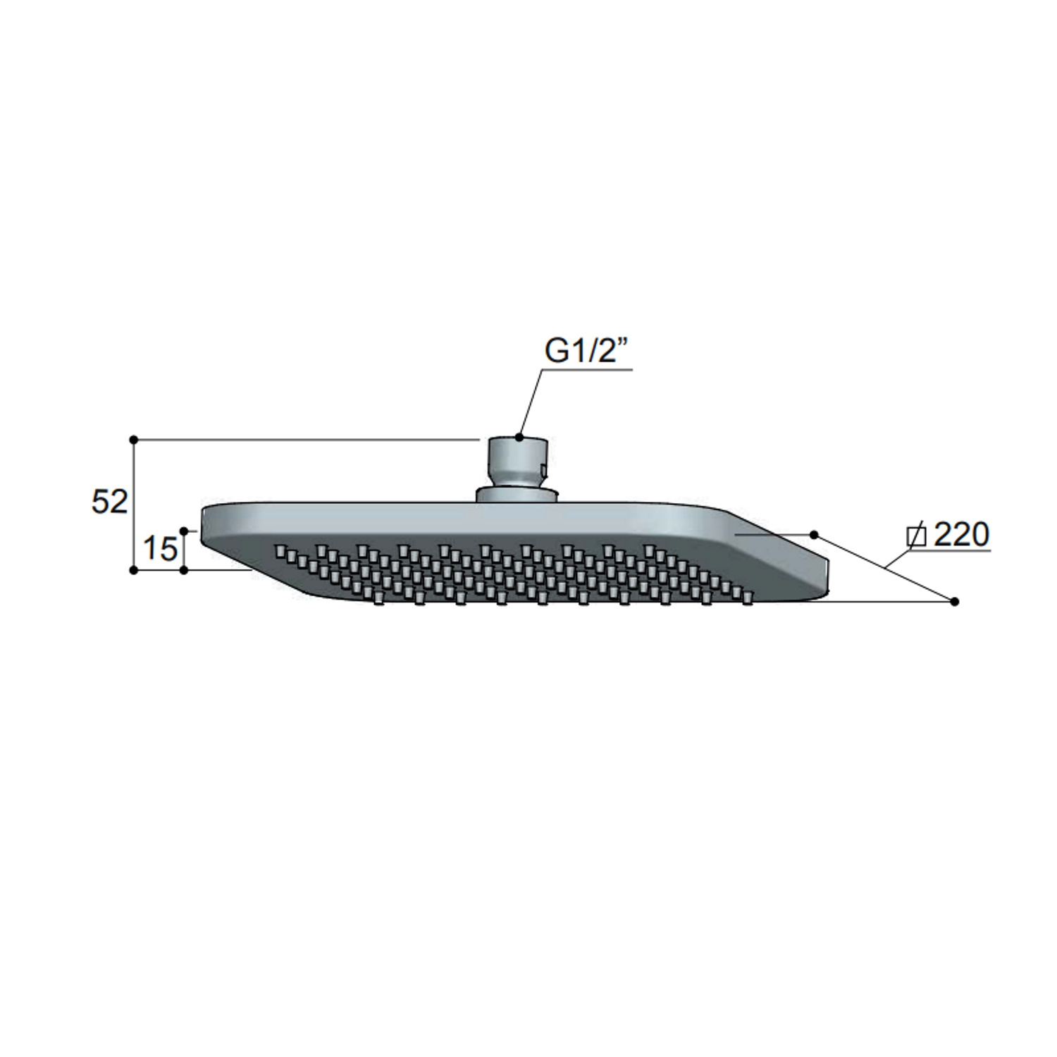 De hoofddouche is vierkant en is 22 bij 22 cm en is anderhalve cm dik. Let op dat er geen wandarm of plafonduitloop bij zit en dat apart besteld moet worden.