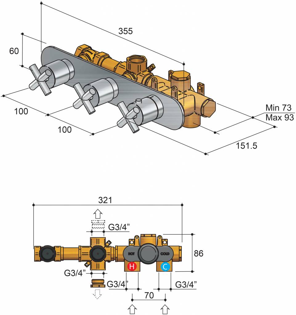 Inbouw douchethermostaat, horizontaal plaatsbaar model, ook verkrijgbaar als verticaal model. Beschikt over twee stopkranen en is gemaakt van hoogwaardig kwaliteit messing.