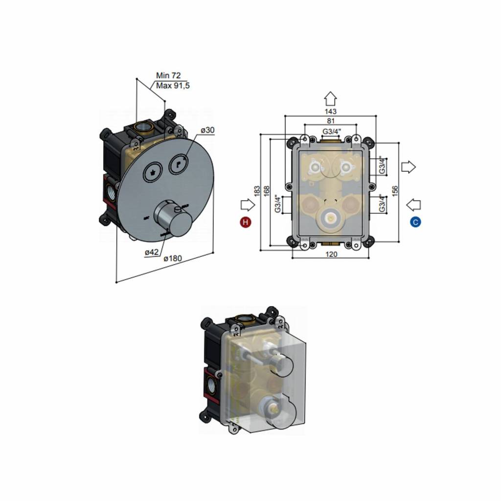 Het afbouwdeel van de thermostaatkraan is het deel wat u ziet aan de muur. Hij is rond met een diameter van 18cm. Voorzien van 3 knoppen, waaronder 2 pushbuttons. De grootste knop is de thermostaat waarmee u de temperatuur van het water bedient. Met de twee kleinere knoppen regelt u uit welke richting het water komt; de hoofddouche of handdouche. Van het inbouwdeel ziet u overigens helemaal niets na montage. Dat zit natuurlijk weg gewerkt in de muur.