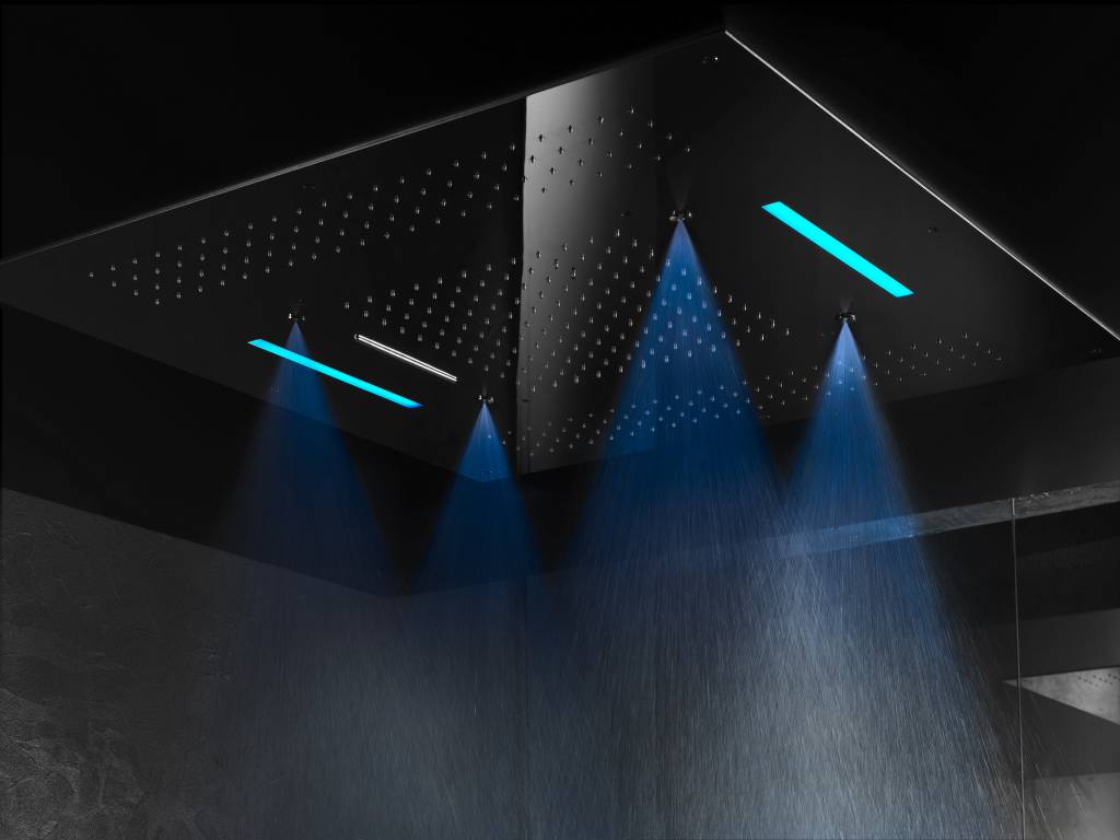 Vierkante inbouw hoofddouche van 95 cm vervaardigd uit RVS. Deze hoofddouche beschikt over een waterval, een nevel functie en LED verlichting. U kunt de LED verlichting van deze hoofddouche met de afstandsbediening afstellen op een van de negen kleuren, ook kunt u een van de twee chromotherapie programma's kiezen.