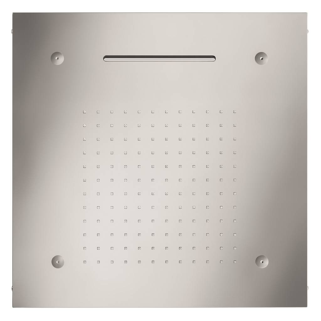 Vierkante inbouw hoofddouche van 50 bij 50 cm, vervaardigd uit messing, chroom of geborsteld nikkel. Deze hoofddouche beschikt over een waterval en een nevel functie. Net als vele andere hoofddouches van Hotbath beschikt dit product over het waterbesparende Shower Power System.