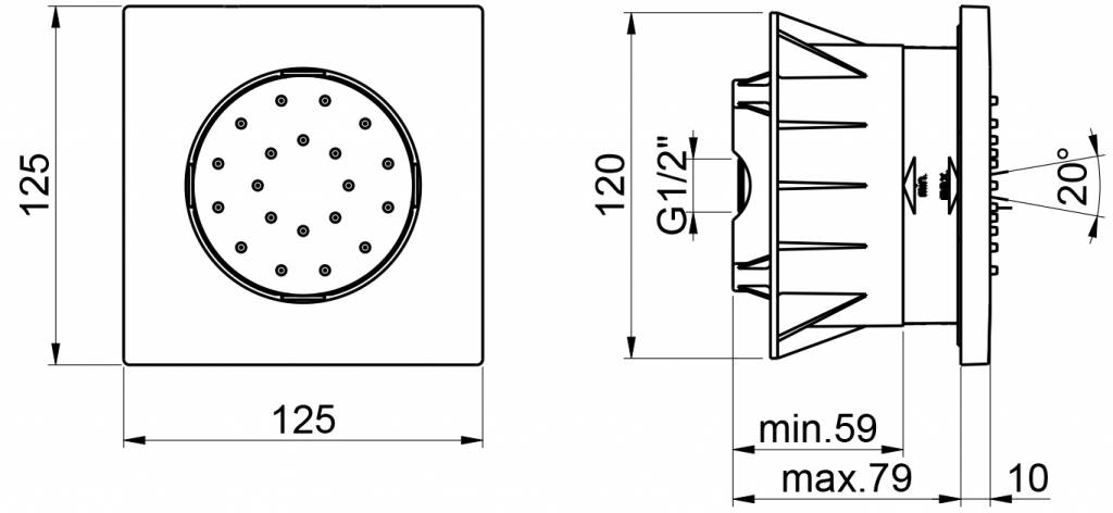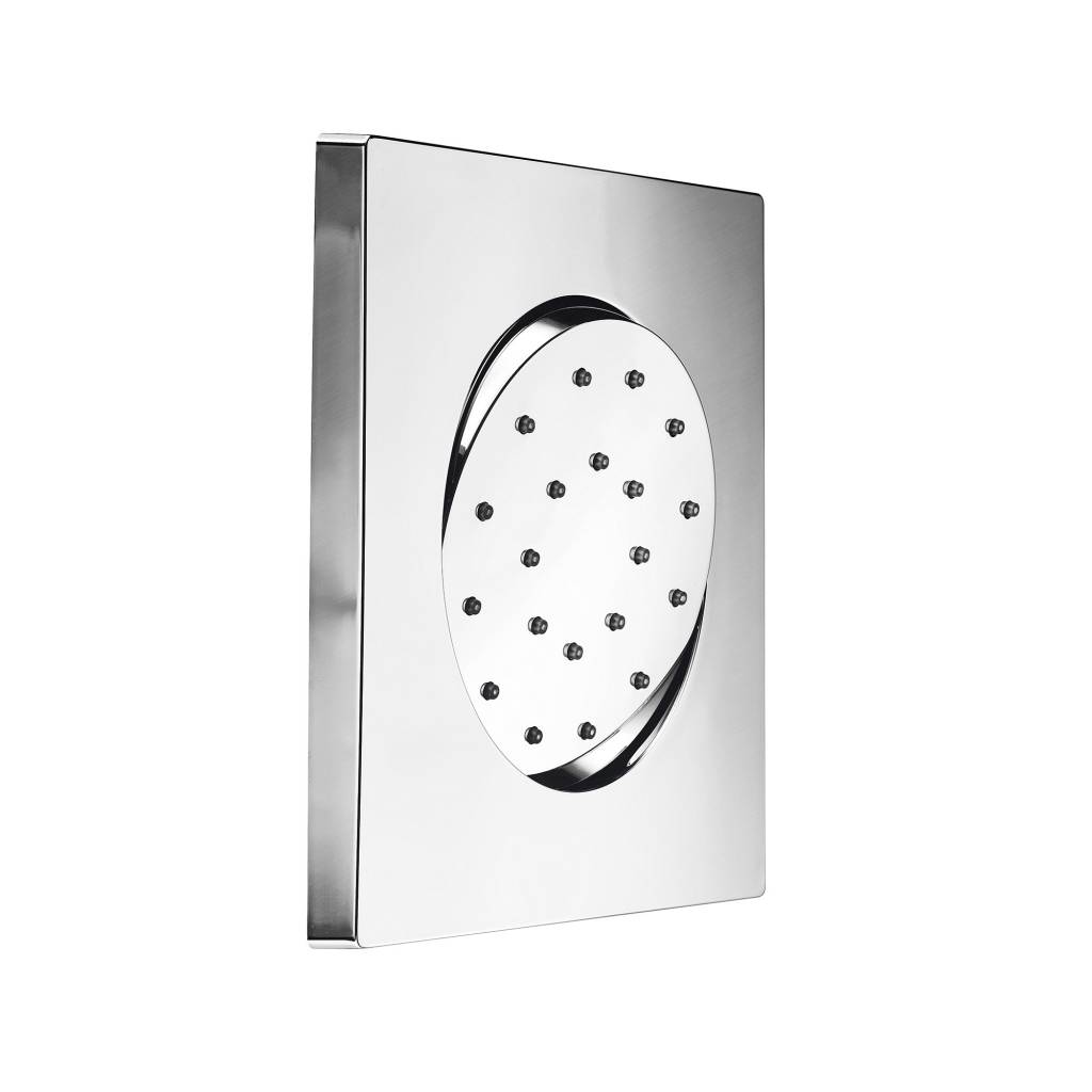 Mate inbouw bodyjet vierkant, kantelbaar model. Deze bodyjet is ook verkrijgbaar in een ronde vorm. Gemaakt van messing en verkrijgbaar in een geborsteld nikkel of chroom uitvoering.