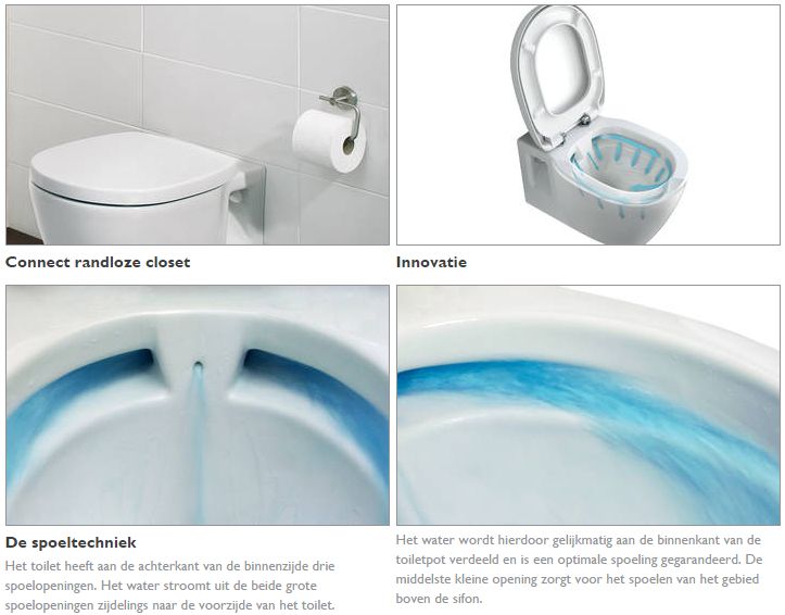 De randloze spoeltechniek is bevorderlijk voor onze gezondheid. Hygiëne speelt namelijk hierbij een hele belangrijke rol. De gebruikelijk spoelrand is komen te vervallen voor deze techniek. As voordeel heeft dat u de pot heel eenvoudig kunt reinigen van de binnenzijde en daarbij wordt er door de techniek effectiever en krachtiger gespoeld dan met een spoelrand. Kortom. Een randloze toiletpot is hygiënischer en makkelijker in gebruik.