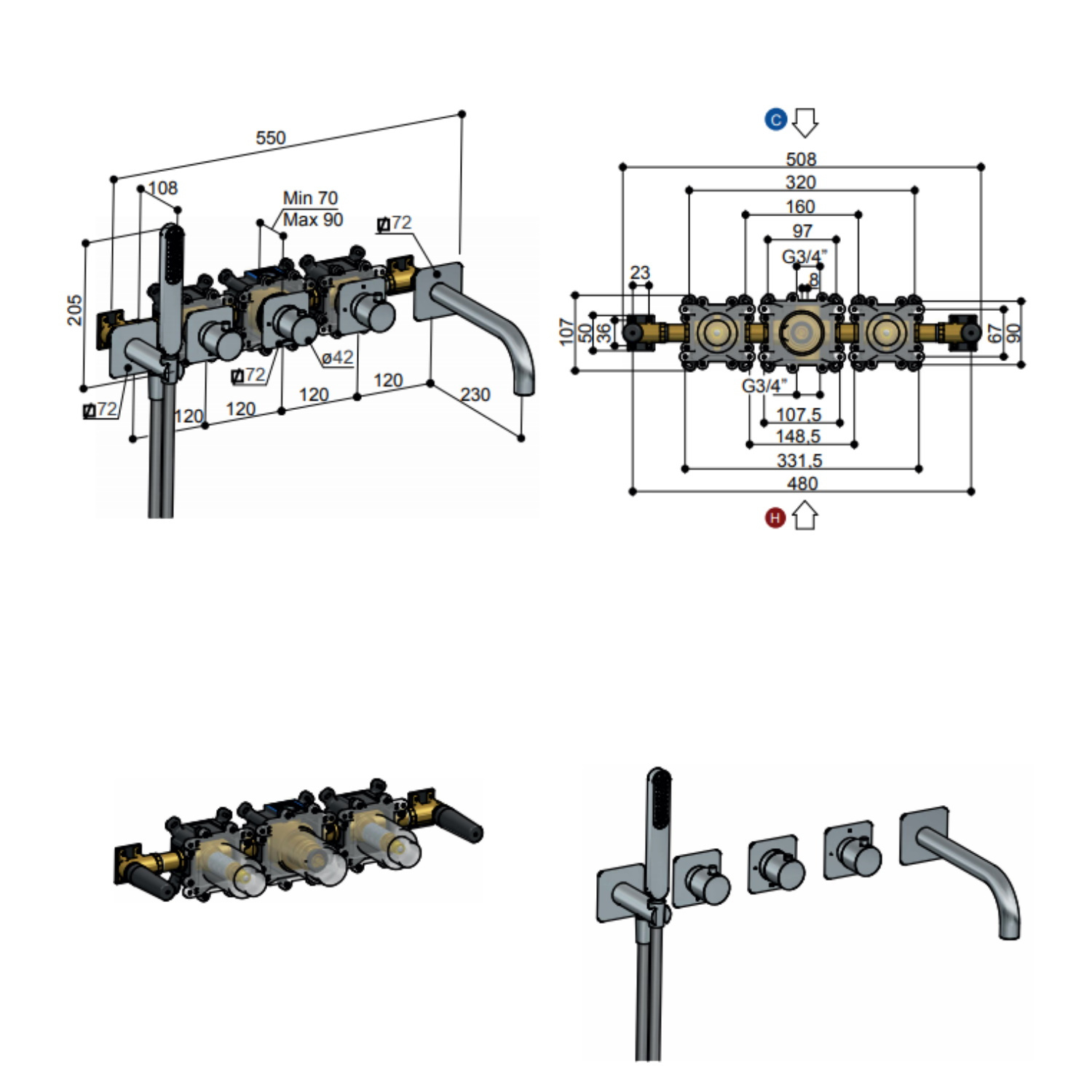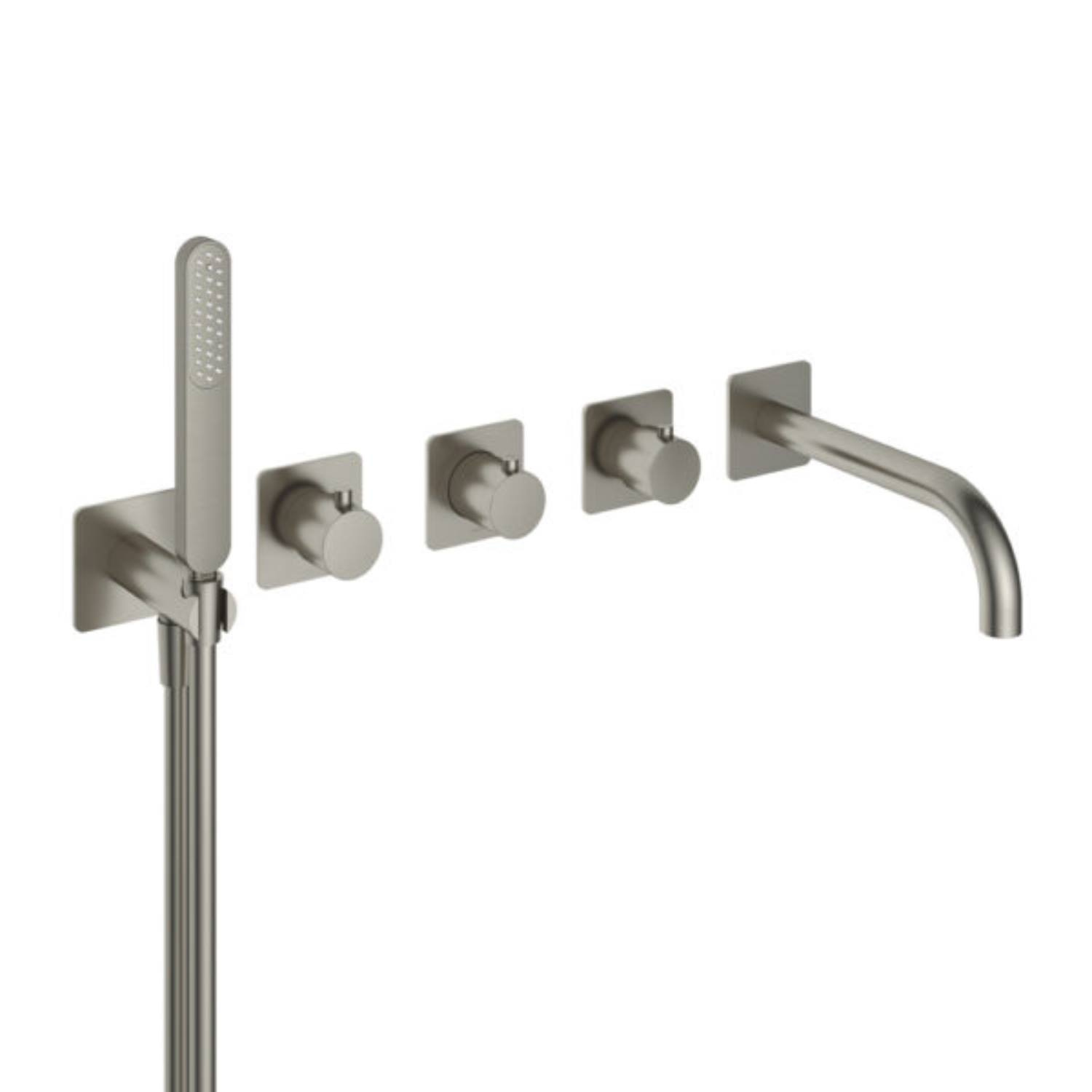 Deze inbouwkraan van Hotbath Gal is een thermostaat badkraan met 2 stopkranen en een uitloop. Door de inbouwbox om te draaien, kan de uitloop zowel links als rechts geplaatst worden. De handdouche heeft 1 stand en geeft maximaal 7.2 liter water per minuut.