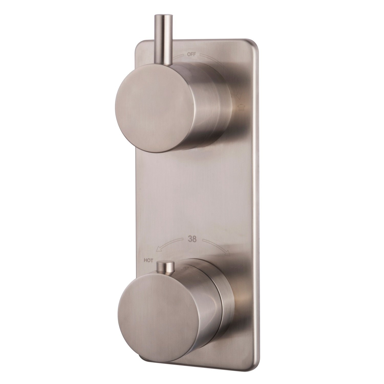 De thermostaat bestaat uit 2 bedieningen. Een bediening is voor de thermostaat en de andere gebruikt u om de kraan mee aan of uit te zetten en u kunt bepalen welke van de twee aansluitingen u wilt gebruiken. Bijvoorbeeld om de handdouche of de hoofddouche aan te zetten. Deze luxe is ideaal voor als u even heerlijk wilt ontspannen. De aftappunten zijn niet gelijktijdig te gebruiken.