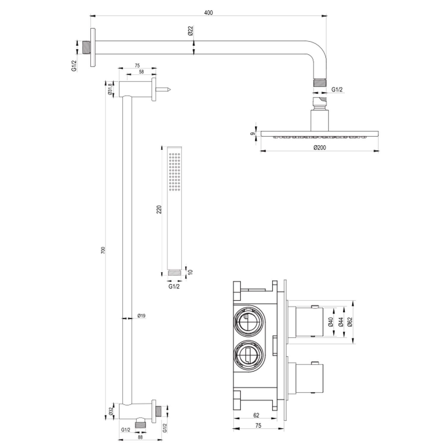 De set bestaat uit een inbouwthermostaat, een afbouw deel van de thermostaat kraan, een wandarm, een hoofddouche met een diameter van 20 cm, een handdouche inclusief glijstang en doucheslang. De thermostaatkraan, met 3/4'' aansluiting, is eenvoudig te bedienen door de twee knoppen. Met de onderste knop kunt u eenvoudig de temperatuur van het water instellen. De thermostaat beschikt over een kinderbeveiliging bij 38 graden, waardoor u nooit per ongeluk onder een kokend hete douche zat staan. met de bovenste knop bepaalt u de gewenste douchstand en kunt u switchen tussen de hoofd- en handdouche.