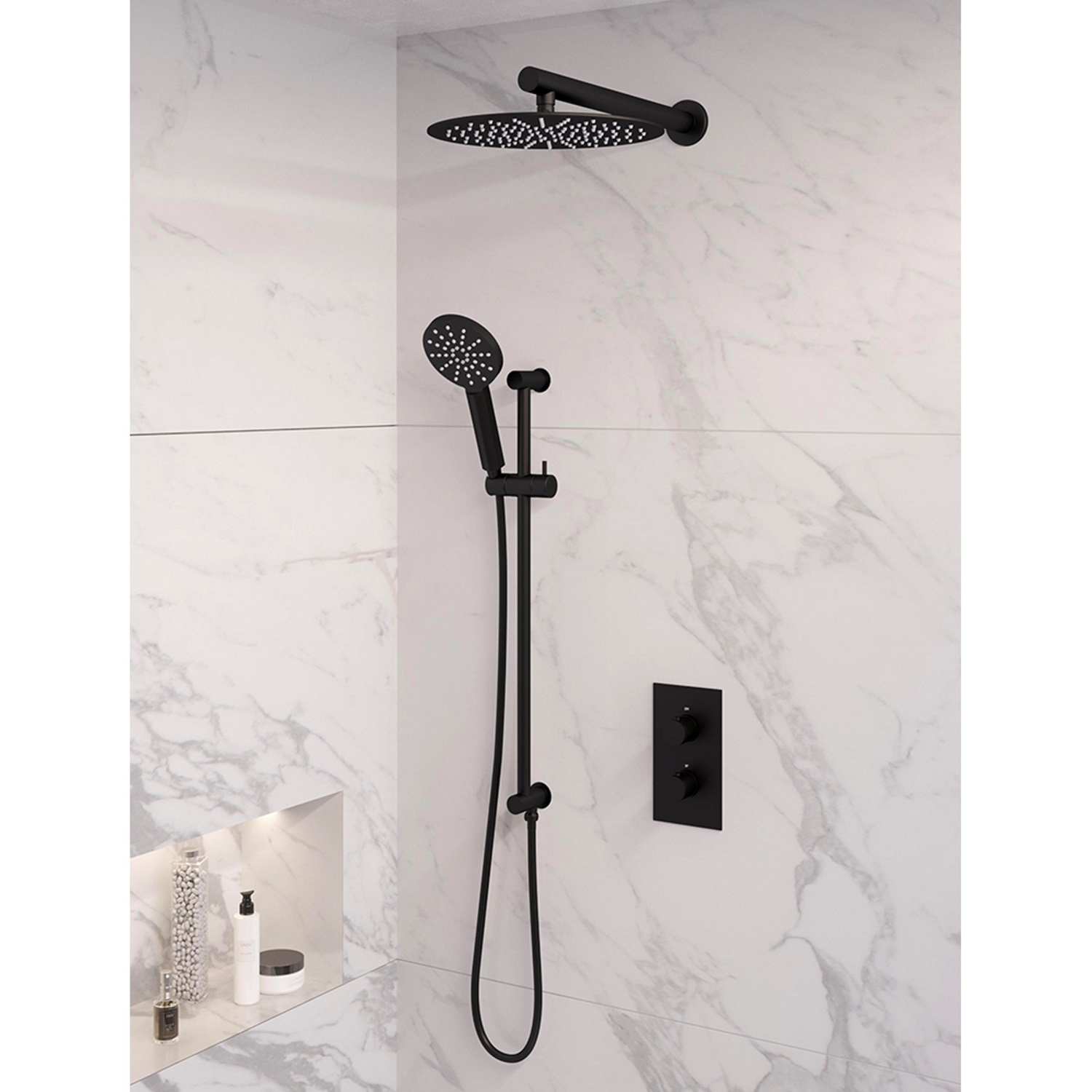 De set bestaat uit een inbouwthermostaat, een afbouw deel van de thermostaat kraan, een wandarm, een hoofddouche met een diameter van 30 cm, een handdouche inclusief glijstang en doucheslang. De thermostaatkraan, met 3/4'' aansluiting, is eenvoudig te bedienen door de twee knoppen. Met de onderste knop kunt u eenvoudig de temperatuur van het water instellen. De thermostaat beschikt over een kinderbeveiliging bij 38 graden, waardoor u nooit per ongeluk onder een kokend hete douche zat staan. met de bovenste knop bepaalt u de gewenste douchstand en kunt u switchen tussen de hoofd- en handdouche.