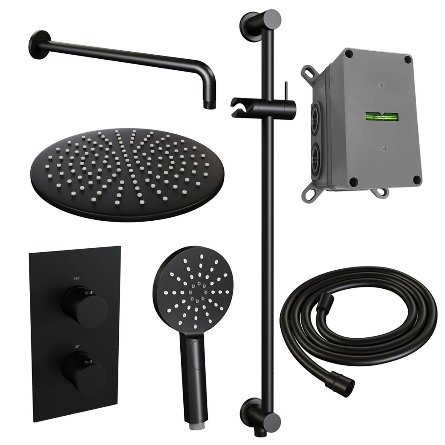 De set bestaat uit een inbouwthermostaat, een afbouw deel van de thermostaat kraan, een wandarm, een hoofddouche met een diameter van 30 cm, een handdouche inclusief glijstang en doucheslang. De thermostaatkraan, met 3/4'' aansluiting, is eenvoudig te bedienen door de twee knoppen. Met de onderste knop kunt u eenvoudig de temperatuur van het water instellen. De thermostaat beschikt over een kinderbeveiliging bij 38 graden, waardoor u nooit per ongeluk onder een kokend hete douche zat staan. met de bovenste knop bepaalt u de gewenste douchstand en kunt u switchen tussen de hoofd- en handdouche.