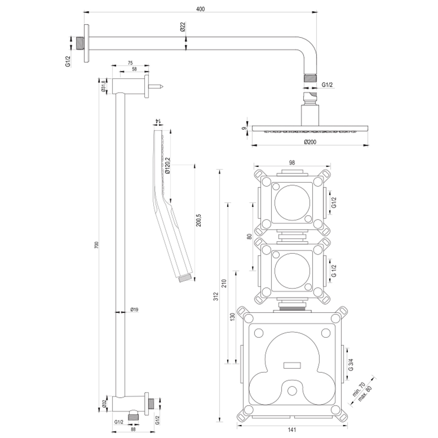 De set bestaat uit een inbouwthermostaat, een afbouw deel van de thermostaat kraan, een wandarm, een hoofddouche met een diameter van 20 cm, een handdouche inclusief glijstang en doucheslang. De thermostaatkraan, met 3/4'' aansluiting, is eenvoudig te bedienen door de twee knoppen. Met de grote knop kunt u eenvoudig de temperatuur van het water instellen. De thermostaat beschikt over een kinderbeveiliging bij 38 graden, waardoor u nooit per ongeluk onder een kokend hete douche zat staan. Door te draaien aan de twee kleinere knoppen kunt u de hoofd- en de handdouche bedienen