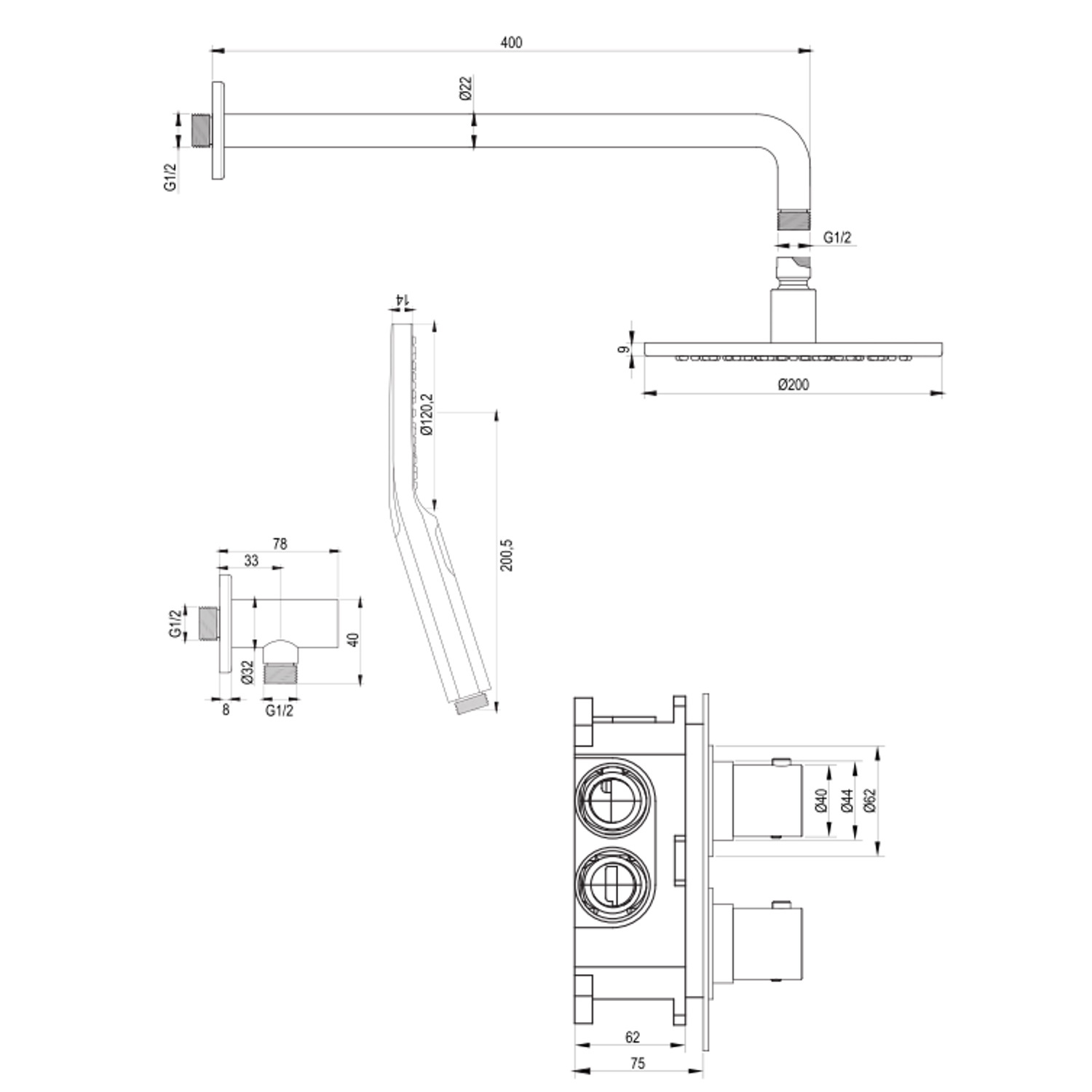 De set bestaat uit een inbouwthermostaat, een afbouw deel van de thermostaat kraan, een wandarm, een hoofddouche met een diameter van 20 cm, een handdouche inclusief wandarm en doucheslang. De thermostaatkraan, met 3/4'' aansluiting, is eenvoudig te bedienen door de twee knoppen. Met de onderste knop kunt u eenvoudig de temperatuur van het water instellen. De thermostaat beschikt over een kinderbeveiliging bij 38 graden, waardoor u nooit per ongeluk onder een kokend hete douche zat staan. met de bovenste knop bepaalt u de gewenste douchstand en kunt u switchen tussen de hoofd- en handdouche.
