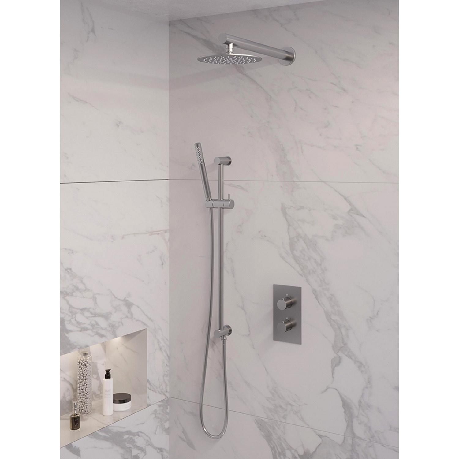 De set bestaat uit een inbouwthermostaat, een afbouw deel van de thermostaat kraan, een wandarm, een hoofddouche met een diameter van 20 cm, een handdouche inclusief glijstang en doucheslang. De thermostaatkraan, met 3/4'' aansluiting, is eenvoudig te bedienen door de twee knoppen. Met de onderste knop kunt u eenvoudig de temperatuur van het water instellen. De thermostaat beschikt over een kinderbeveiliging bij 38 graden, waardoor u nooit per ongeluk onder een kokend hete douche zat staan. met de bovenste knop bepaalt u de gewenste douchstand en kunt u switchen tussen de hoofd- en handdouche.