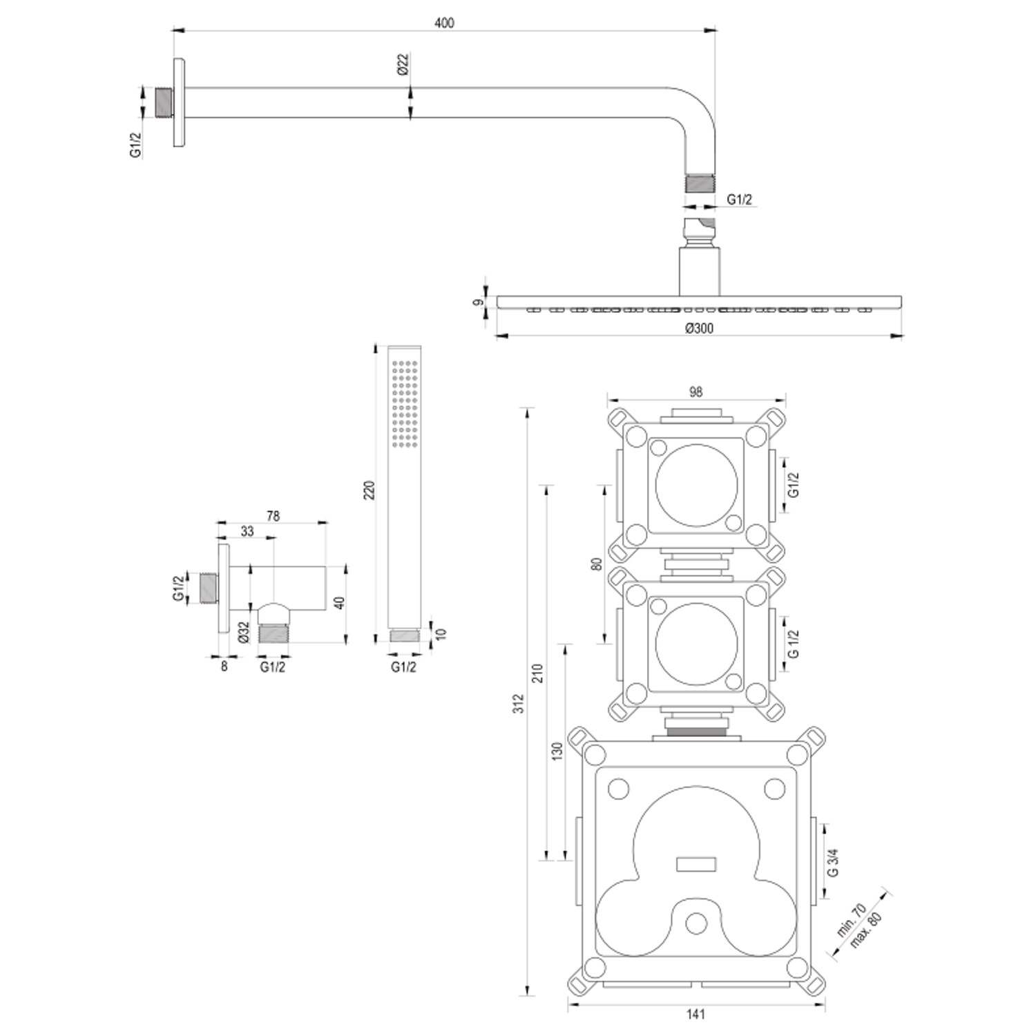 De set bestaat uit een inbouwthermostaat, een afbouw deel van de thermostaat kraan, een wandarm, een hoofddouche met een diameter van 30 cm, een handdouche inclusief wandarm en doucheslang. De thermostaatkraan, met 3/4'' aansluiting, is eenvoudig te bedienen door de twee knoppen. Met de grote knop kunt u eenvoudig de temperatuur van het water instellen. De thermostaat beschikt over een kinderbeveiliging bij 38 graden, waardoor u nooit per ongeluk onder een kokend hete douche zat staan. Door te draaien aan de twee kleinere knoppen kunt u de hoofd- en de handdouche bedienen