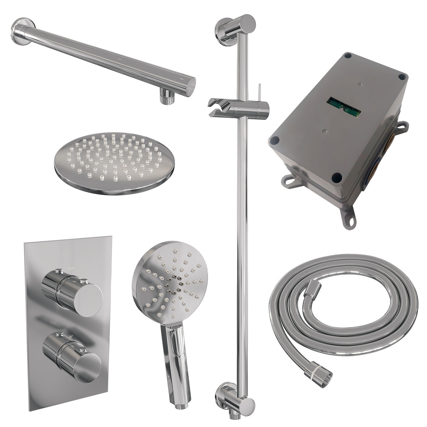 De set bestaat uit een inbouwthermostaat, een afbouw deel van de thermostaat kraan, een wandarm, een hoofddouche met een diameter van 20 cm, een handdouche inclusief glijstang en doucheslang. De thermostaatkraan, met 3/4'' aansluiting, is eenvoudig te bedienen door de twee knoppen. Met de onderste knop kunt u eenvoudig de temperatuur van het water instellen. De thermostaat beschikt over een kinderbeveiliging bij 38 graden, waardoor u nooit per ongeluk onder een kokend hete douche zat staan. met de bovenste knop bepaalt u de gewenste douchstand en kunt u switchen tussen de hoofd- en handdouche.