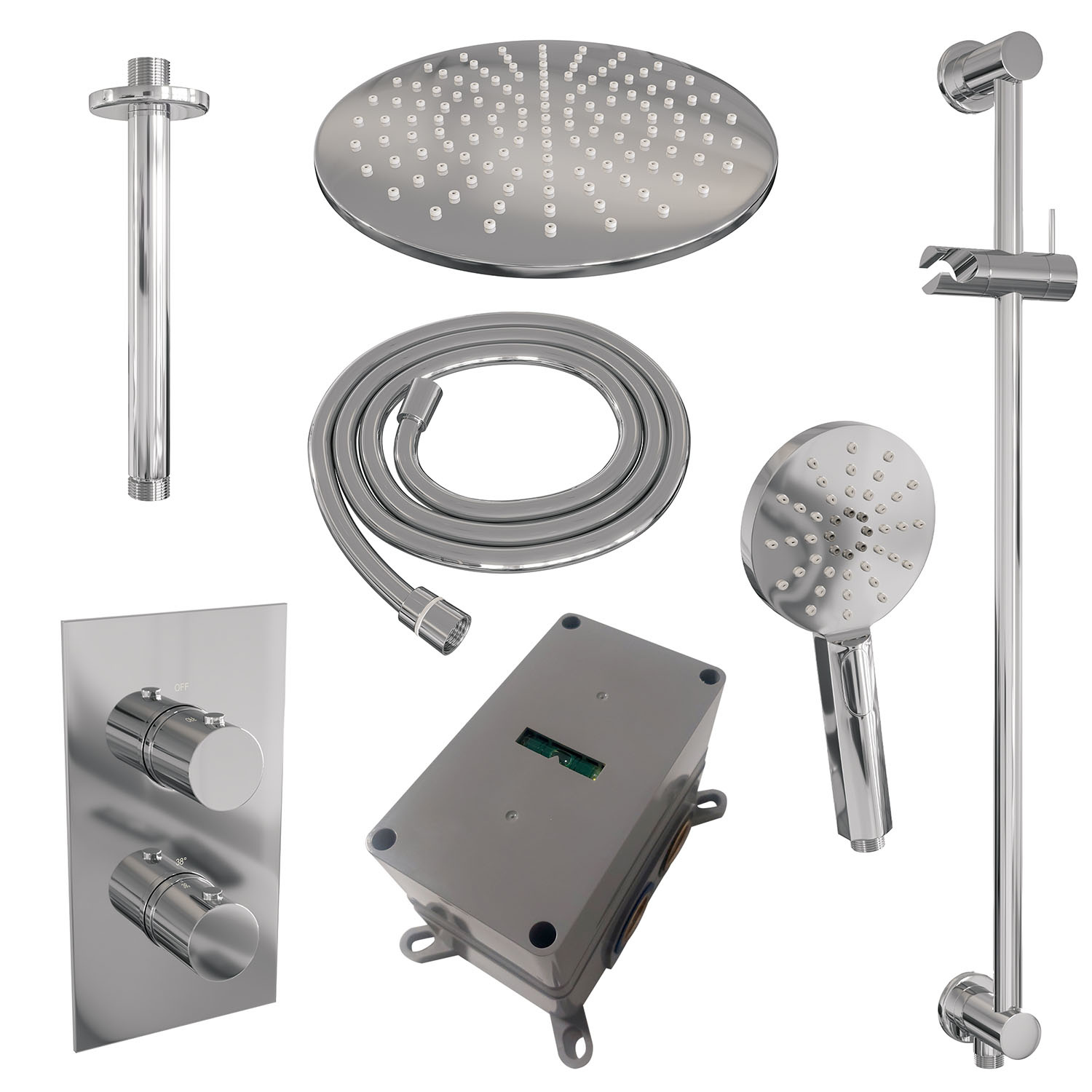 De set bestaat uit een inbouwthermostaat, een afbouw deel van de thermostaat kraan, een plafond arm, een hoofddouche met een diameter van 30 cm, een handdouche inclusief glijstang en doucheslang. De thermostaatkraan, met 3/4'' aansluiting, is eenvoudig te bedienen door de twee knoppen. Met de onderste knop kunt u eenvoudig de temperatuur van het water instellen. De thermostaat beschikt over een kinderbeveiliging bij 38 graden, waardoor u nooit per ongeluk onder een kokend hete douche zat staan. met de bovenste knop bepaalt u de gewenste douchstand en kunt u switchen tussen de hoofd- en handdouche.