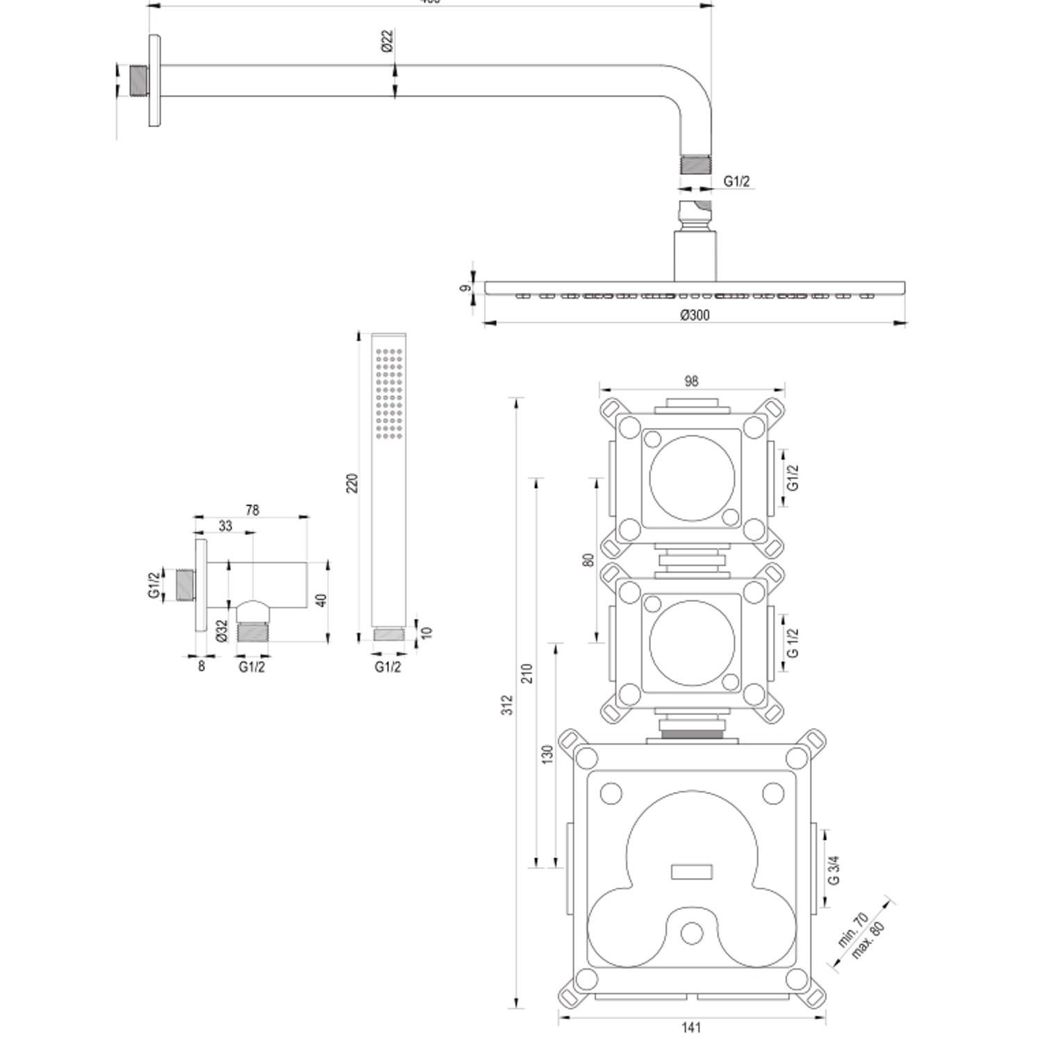 De set bestaat uit een inbouwthermostaat, een afbouw deel van de thermostaat kraan, een wandarm, een hoofddouche met een diameter van 30 cm, een handdouche inclusief wandarm en doucheslang. De thermostaatkraan, met 3/4'' aansluiting, is eenvoudig te bedienen door de drie knoppen. Met de grote knop kunt u eenvoudig de temperatuur van het water instellen. De thermostaat beschikt over een kinderbeveiliging bij 38 graden, waardoor u nooit per ongeluk onder een kokend hete douche zat staan. Door te draaien aan de twee kleinere knoppen kunt u de hoofd- en de handdouche bedienen