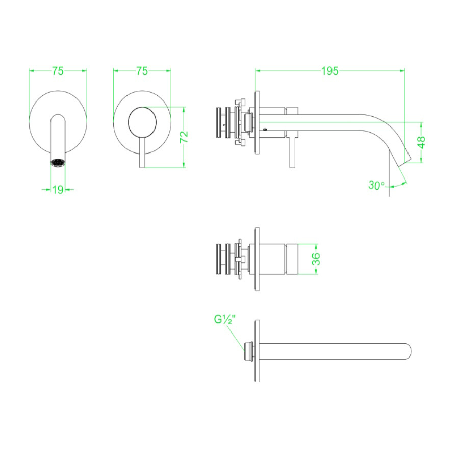 De wastafelkraan heeft een uitloop lengte van 19,5 cm en een uitloop hoogte van 4,8 cm. De kraan heeft een breedte van 7,5 cm en een diameter van 1,9 cm. De maat van de draadaansluiting is 1/2 inch.