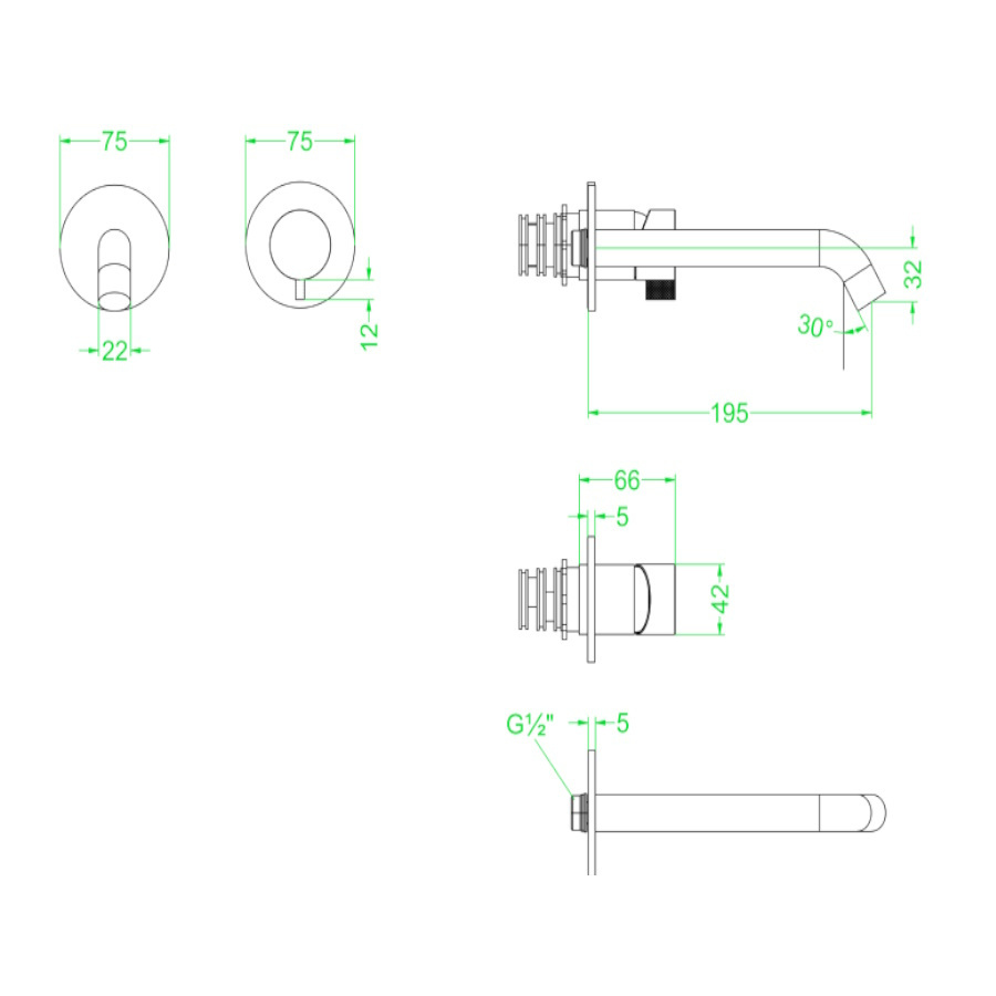 De wastafelkraan heeft een uitloop lengte van 19,5 cm en een uitloop hoogte van 3,2 cm. De kraan heeft een breedte van 7,5 cm en een diameter van 2,2 cm. De maat van de draadaansluiting is 1/2 inch.