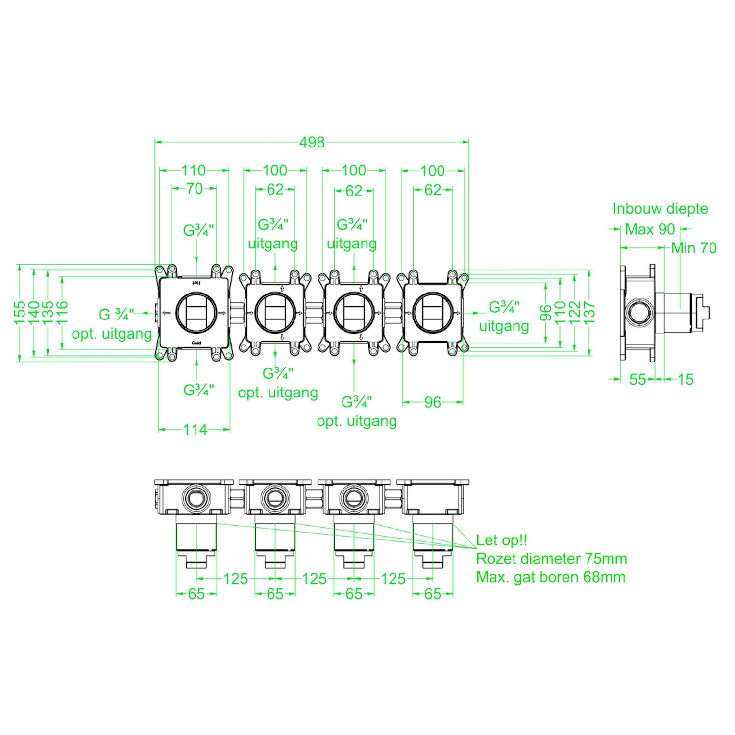 De inbouwboxen hebben een totale lengte van 49,8 cm en een hoogte van 11,6 cm. De inbouw diepte van de inbouwbox is minimaal 7 cm en maximaal 9 cm. De rozet heeft een diameter van 7,5. De maat draadaansluiting is 3/4 inch.