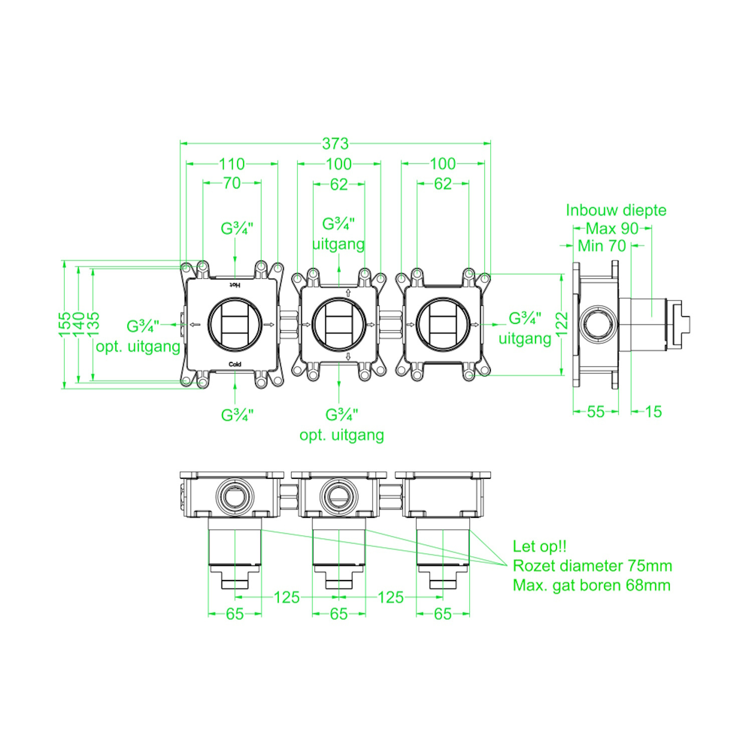 De grote inbouwbox heeft een breedte van 11 cm en een hoogte van 13,5 cm. De 2 kleinere inbouwboxen hebben een breedte van 10 cm en een hoogte van 12,2 cm. De inbouw diepte van de inbouwbox is minimaal 7 cm en maximaal 9 cm. De rozet heeft een diameter van 7,5. De maat draadaansluiting is 3/4 inch.
