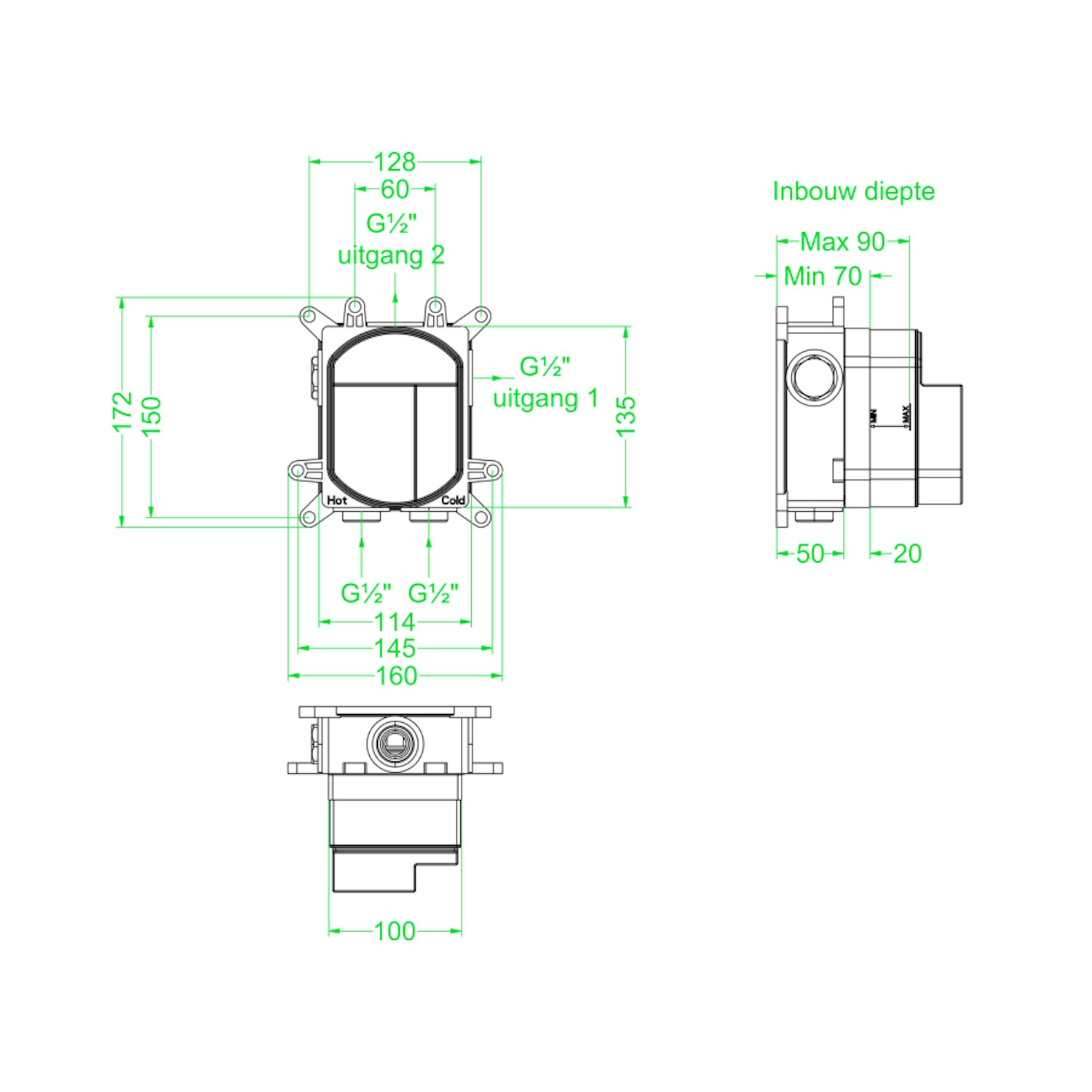 De inbouwbox heeft een breedte van 11,4 cm en een hoogte van 13,5 cm. De inbouw diepte van de inbouwbox is minimaal 7 cm en maximaal 9 cm. De rozet heeft een diameter van 7,5. De maat draadaansluiting is 1/2 inch.