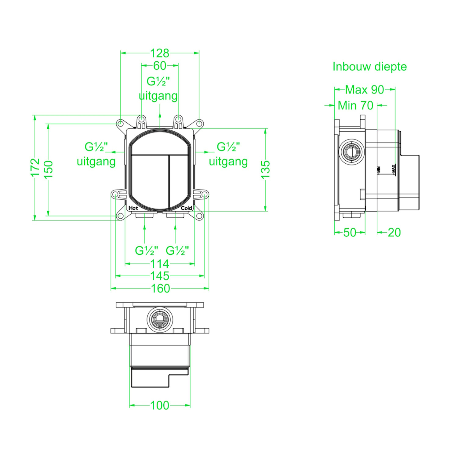 De inbouwbox heeft een breedte van 11,4 cm en een hoogte van 13,5 cm. De inbouw diepte van de inbouwbox is minimaal 7 cm en maximaal 9 cm. De maat draadaansluiting is 1/2 inch.