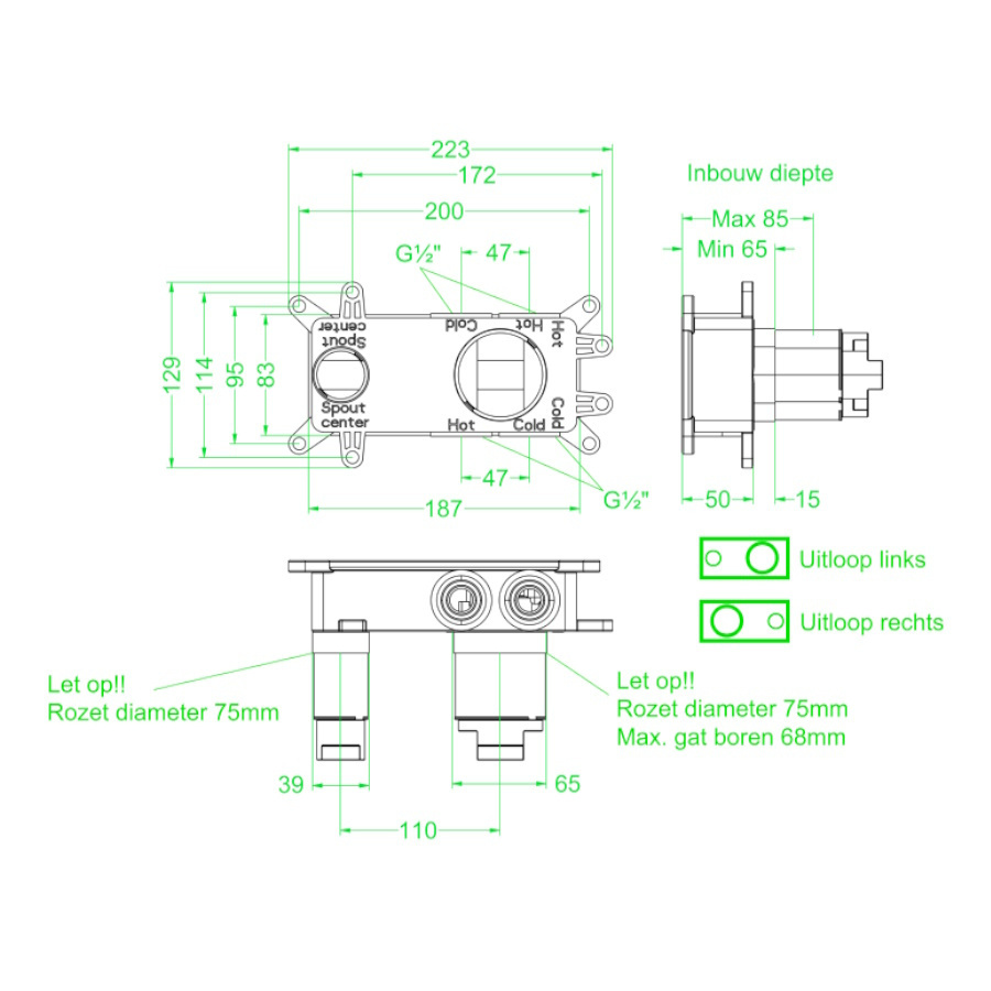 De inbouwbox heeft een lengte van 18,7 cm en een hoogte van 8,3 cm. De inbouw diepte van de inbouwbox is minimaal 6,5 cm en maximaal 8,5 cm. De rozet heeft een diameter van 7,5. De maat draadaansluiting is 1/2 inch.