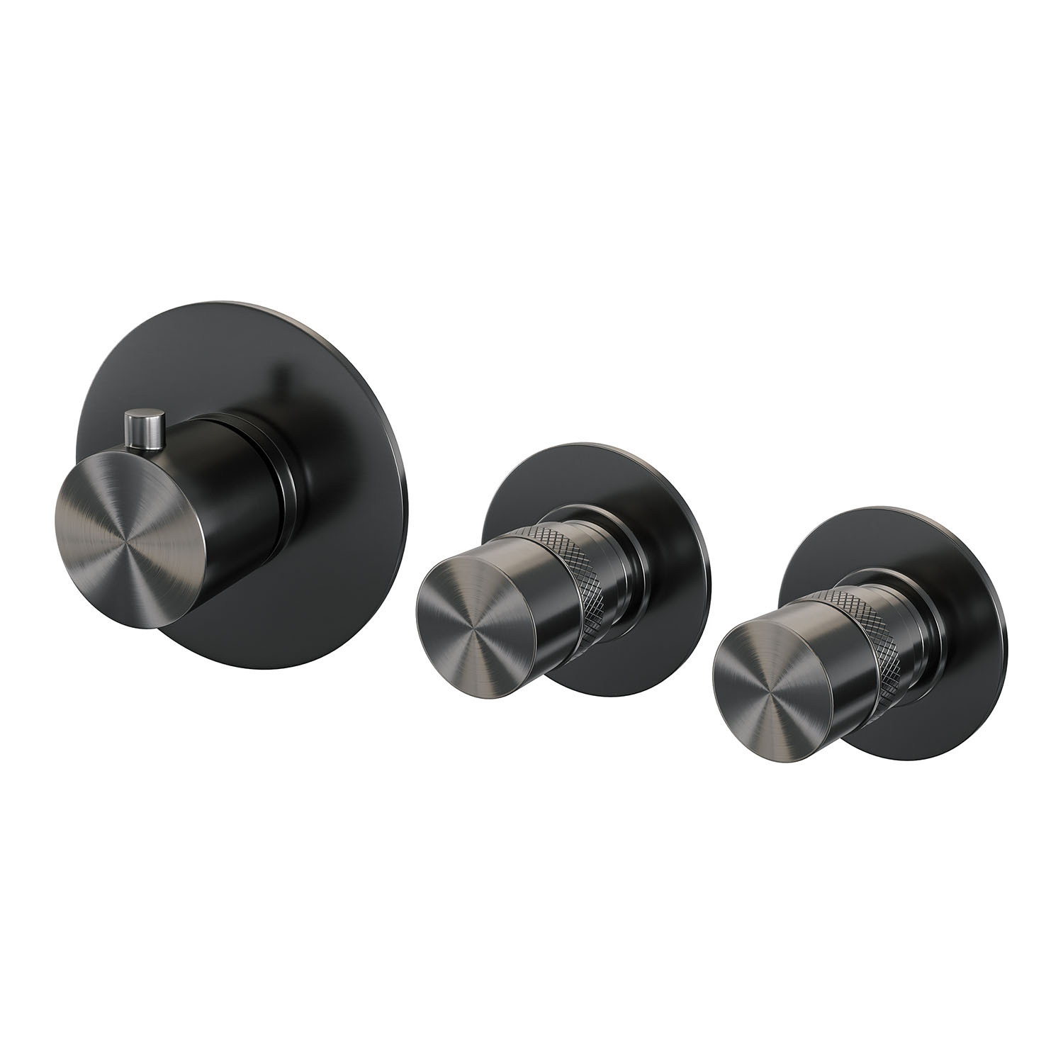 Deze inbouwthermostaat van Brauer komt uit de serie Gunmetal Edition. Hij wordt geleverd met 2 stopkranen die voorzien zijn van een in- en afbouwdeel. De onderdelen zijn gemaakt van messing in een geborstelde gunmetal kleur. De thermostaat heeft een diameter van 13 cm, de stopkranen hebben een diameter van 6.5 cm. De knop op de thermostaat heeft een diameter van 5 cm, die op de stopkraan 3.2 cm.