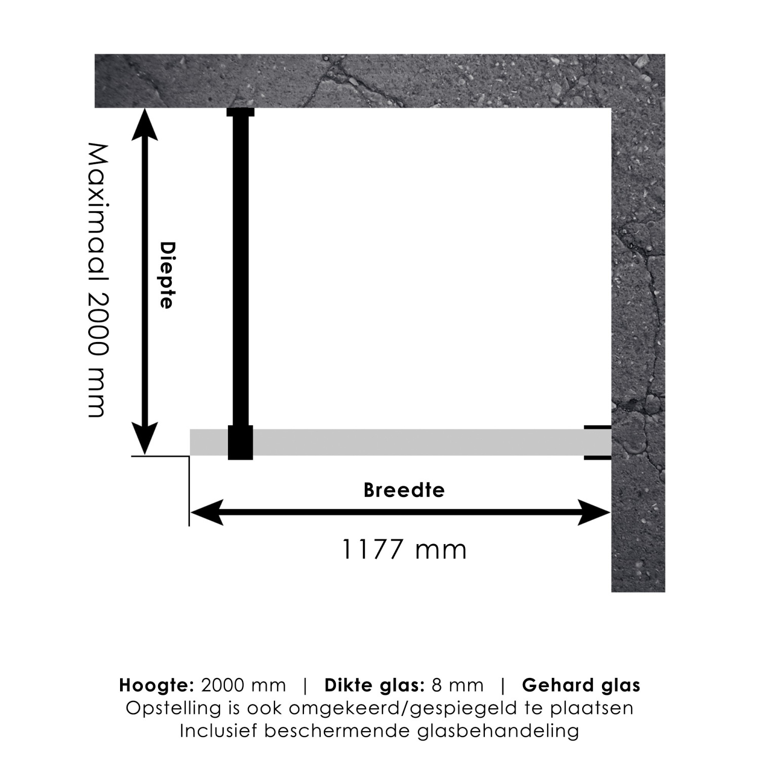 Deze complete inloopdouche bestaat uit een inloopwand en Gunmetal beslag. Inclusief glasbehandeling. De hoogte van de inloopdouche is 200 cm. De cabine is 117,7 cm breed en maximaal 200 cm diep. Deze inloopdouche straalt luxe uit door zijn design en kleur.