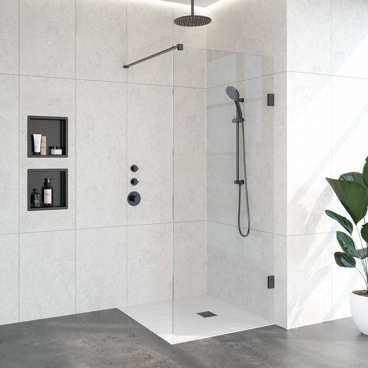 Deze complete inloopdouche bestaat uit een inloopwand met Gunmetal beslag. Inclusief glasbehandeling. De hoogte van de inloopdouche is 200 cm. Hij is 87,7 cm breed en maximaal 200 cm diep. Deze inloopdouche straalt luxe uit door zijn design en kleur.