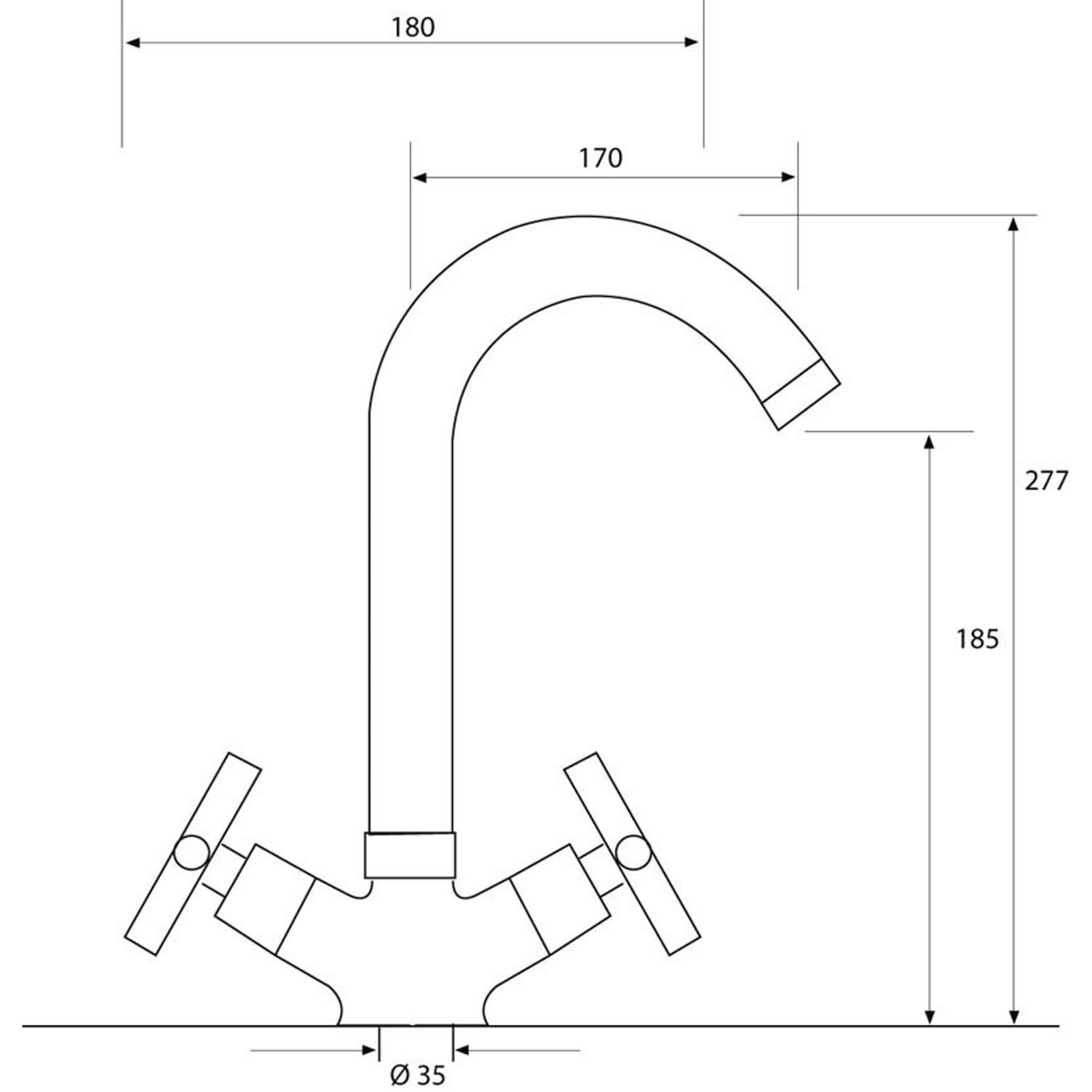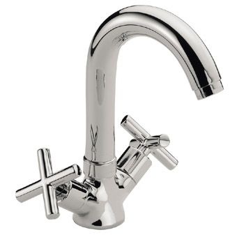 Het is een mengkraan. Door de kruisgrepen te draaien bepaalt u de temperatuur. Hij is van messing, afgewerkt met chroom.